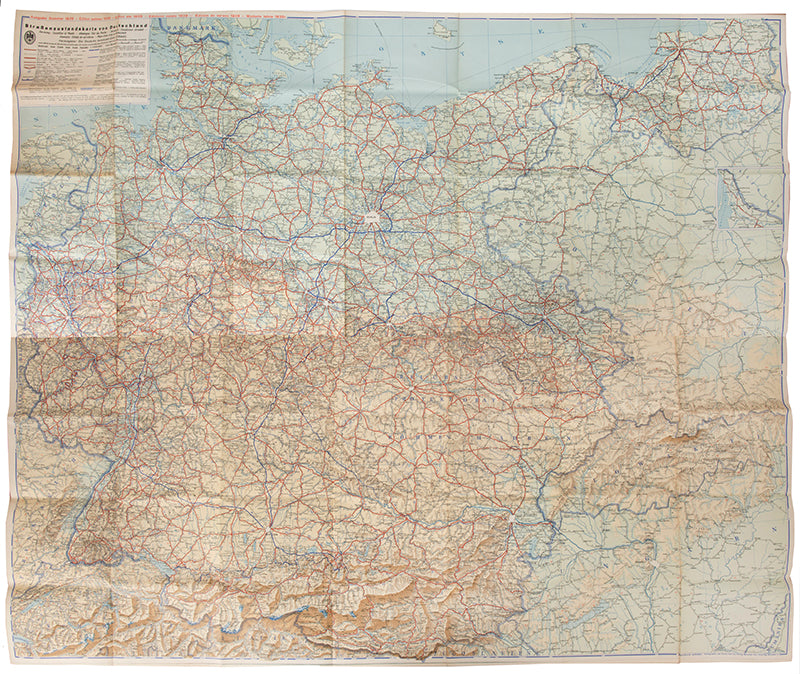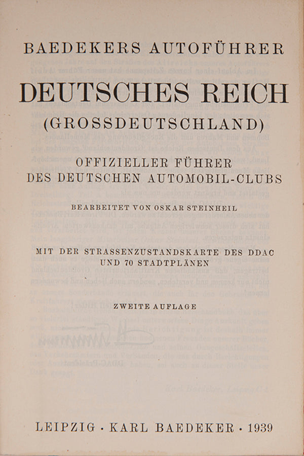 Second edition. xxx, 813pp, 70 town plans, large folding coloured map (Strassenzustandskarte von Deutschland) dated Sommer 1939 inserted loose; publisher's variant coarse-grained binding, gilt lettering bright, spine slightly faded; a very good copy.