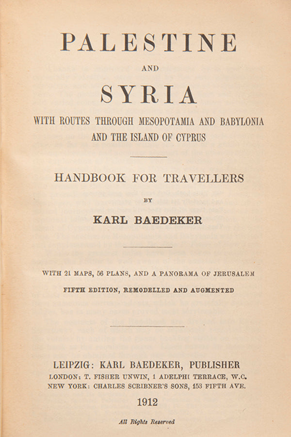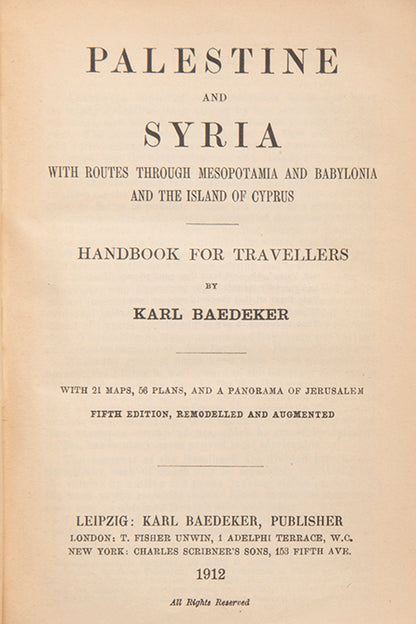 Fifth edition. civ, 462pp, 21 maps, 56 plans, a panorama of Jerusalem; publisher's red cloth gilt, original buff coloured printed dustwrapper; a mint copy.