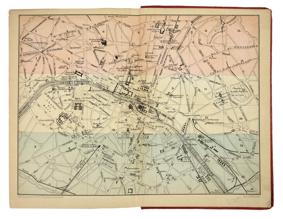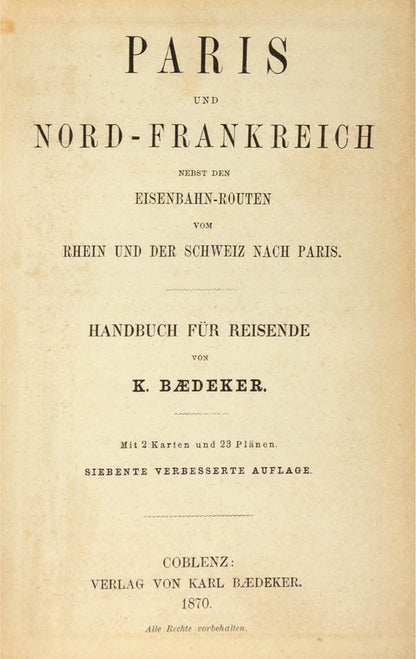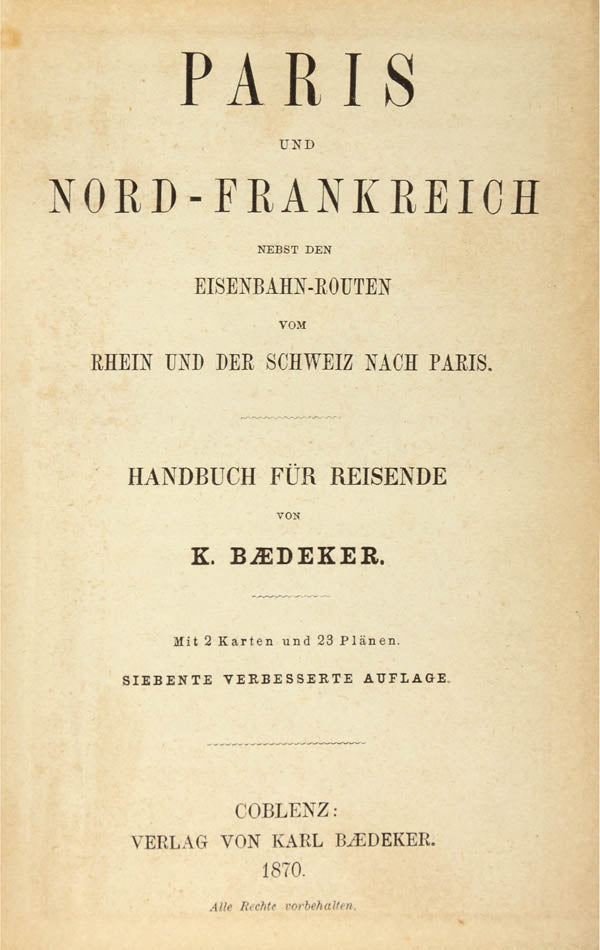 First issued in 1855, 'Paris' was the last series started by Karl Baedeker himself before he died in 1859. The series continued until 1937. This edition was published during the Commune of Paris in 1870. Endpapers dated "Juli 1870".