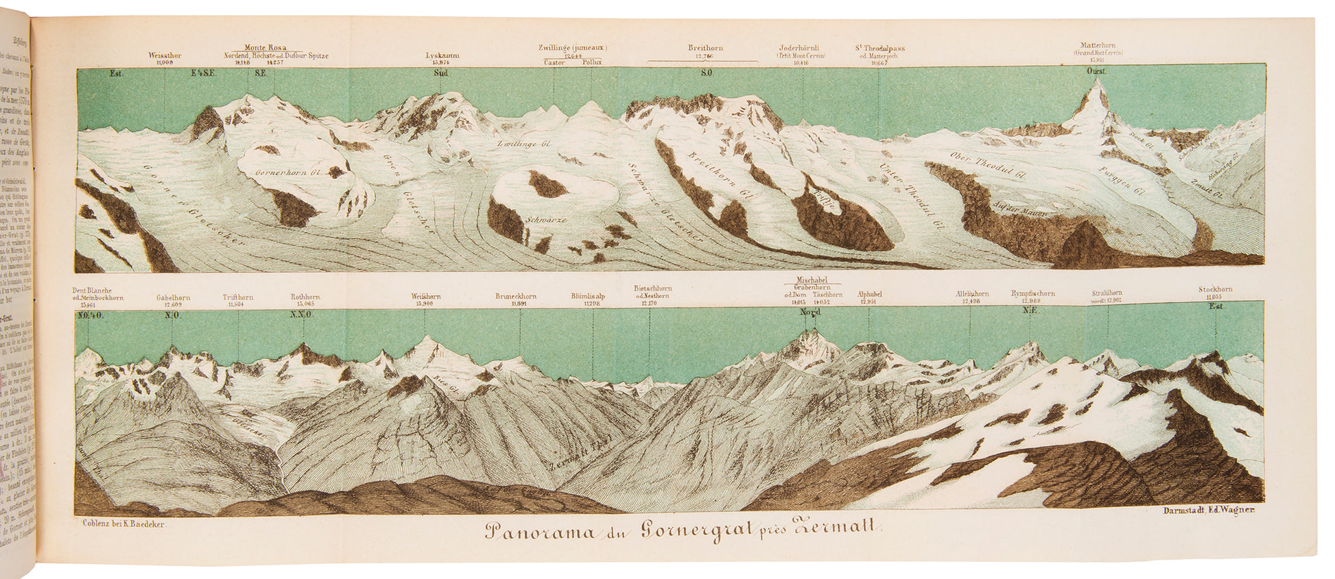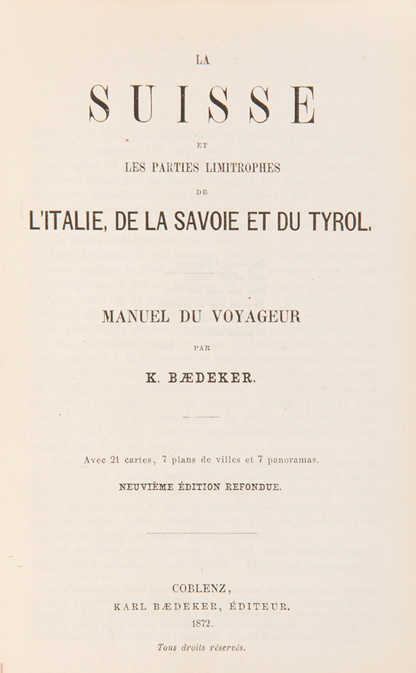 Ninth edition. xliv, 423 pp, 21 maps, 7 town plans, 7 panoramas ( some coloured), previous owner's inscription inside on half title; publisher's old type red cloth gilt, slightly worn at corners and top and bottom of spine; overall a near fine copy.