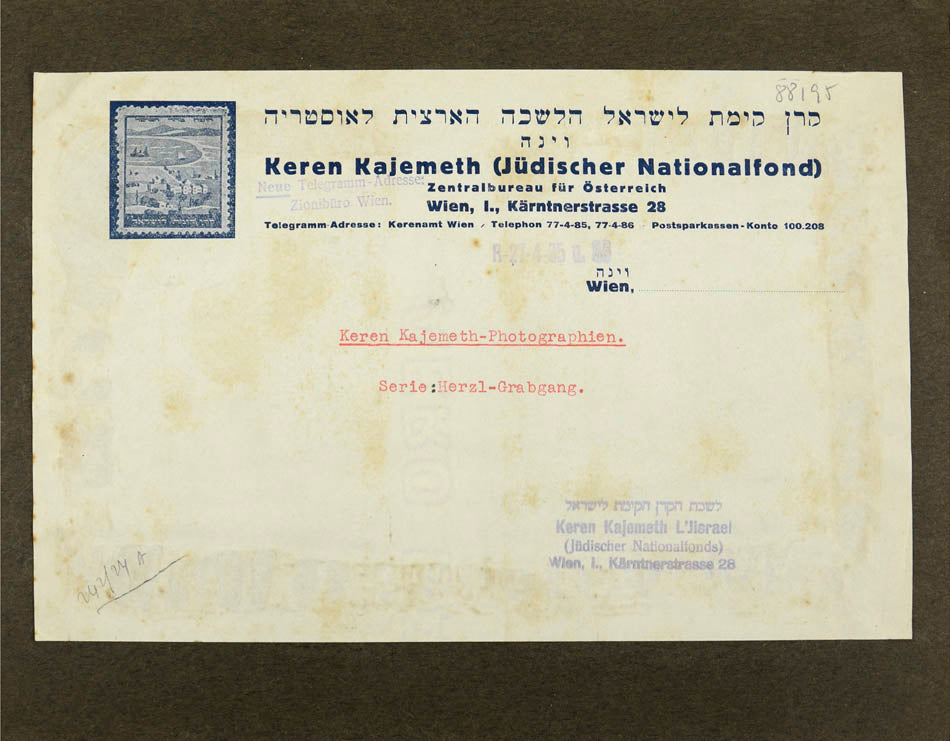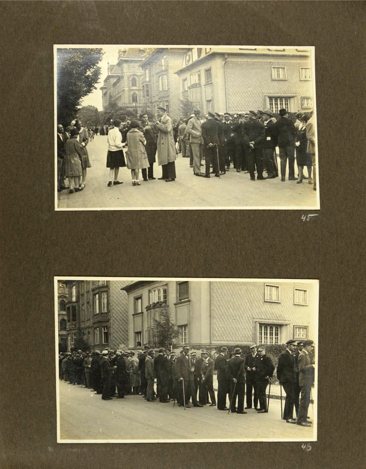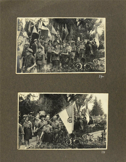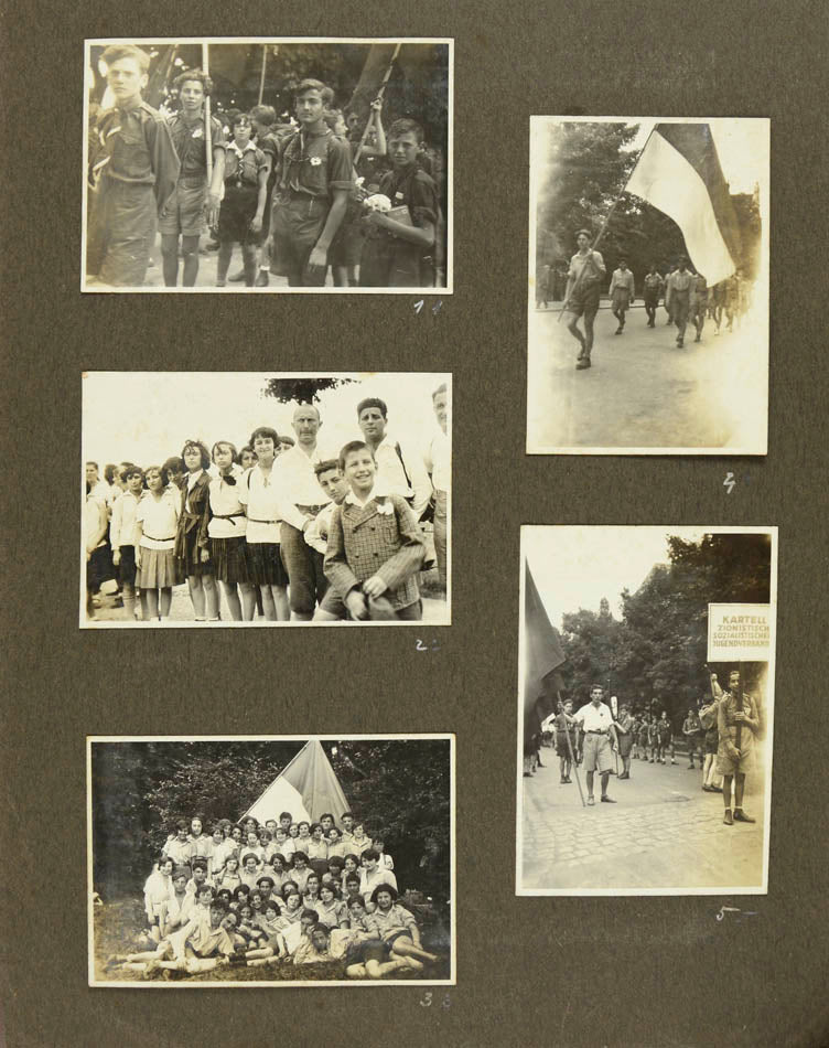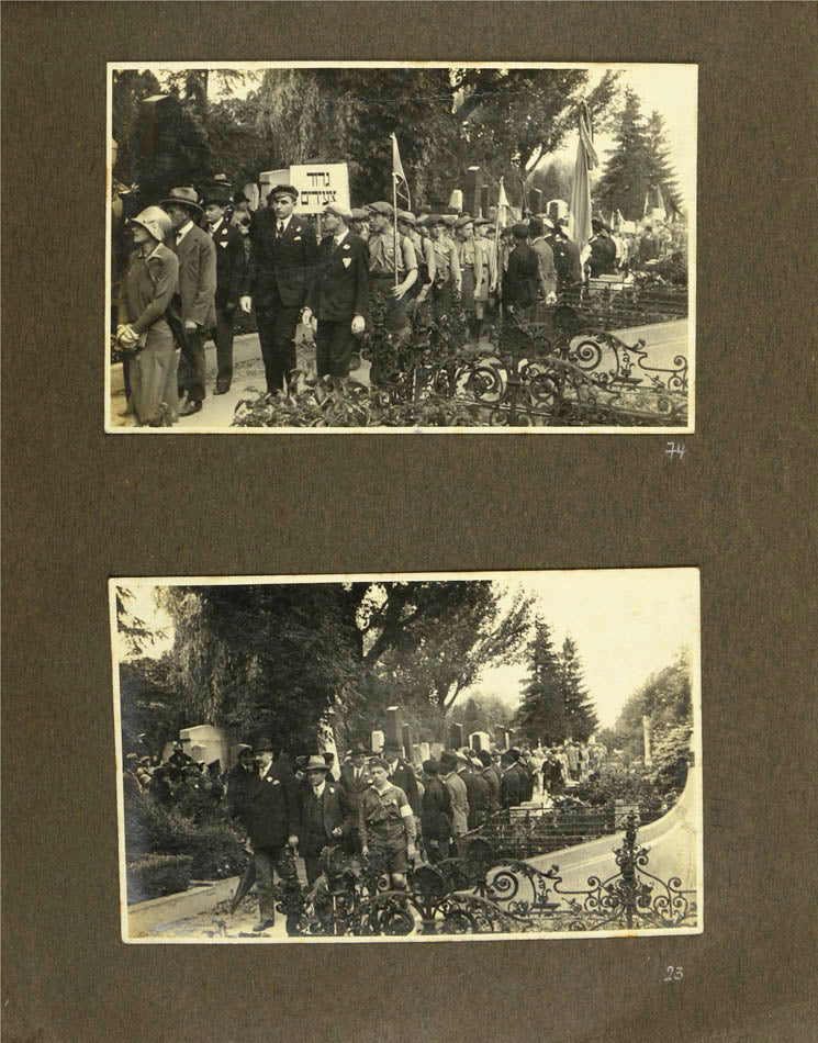Album 3: Scenes from a memorial service for Theodor Herzl, showing Zionist-Socialist youth organisations (Kartell Zionistisch-Sozialistischer Jugendverbande) and their leaders, some with flags, in uniforms and insignia, pass by the graves of Herzl and his parents in the Doblinger Cemetery; with a few scenes captured on the streets of the city. This album offers a unique insight into European Zionist culture with its use of social clubs for different age groups organised in military fashion.