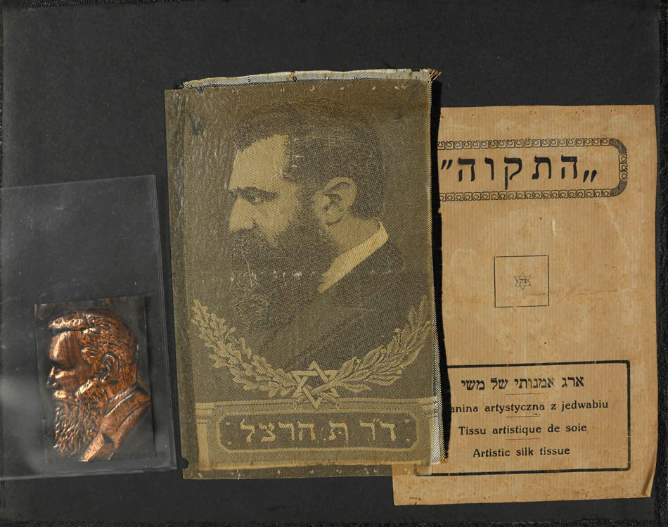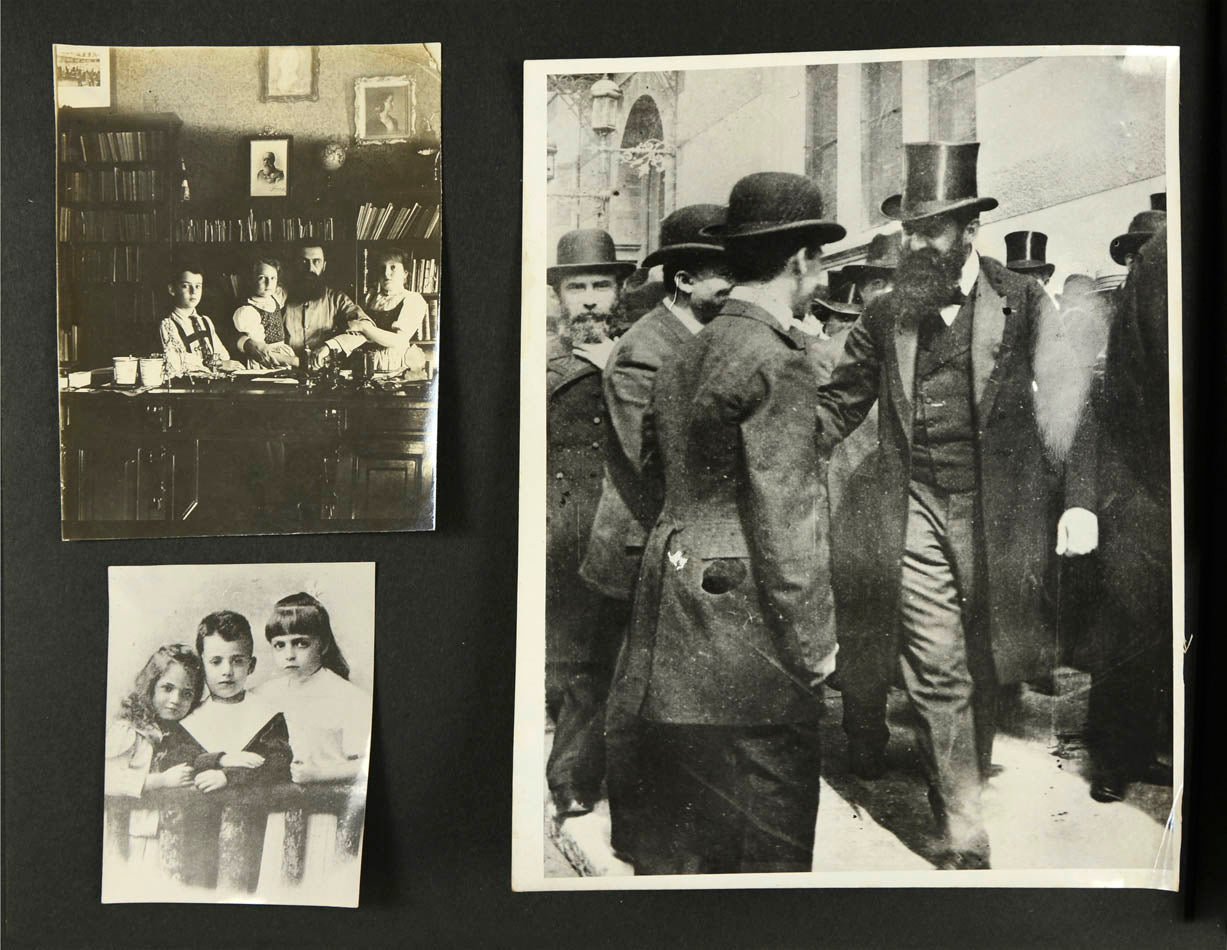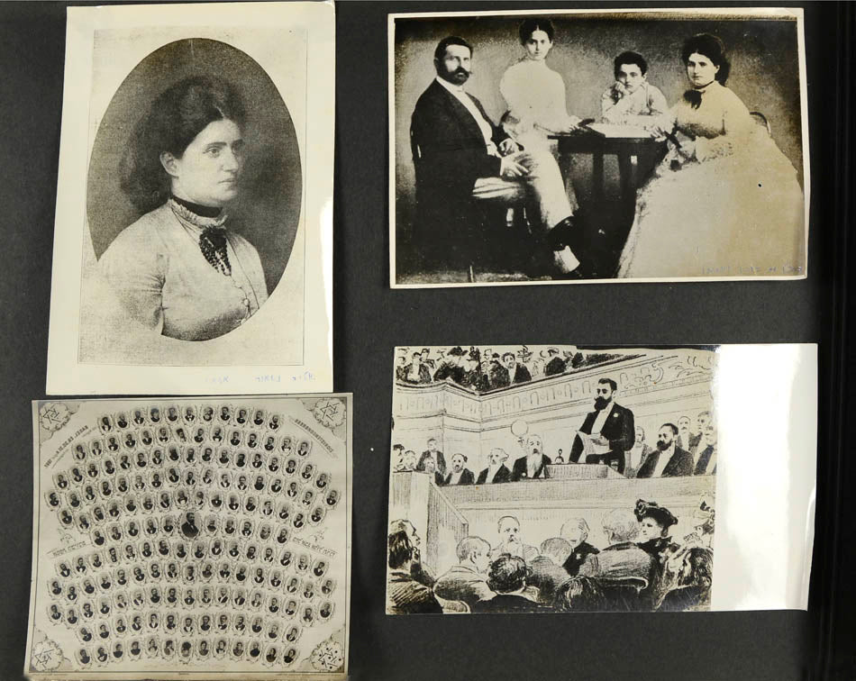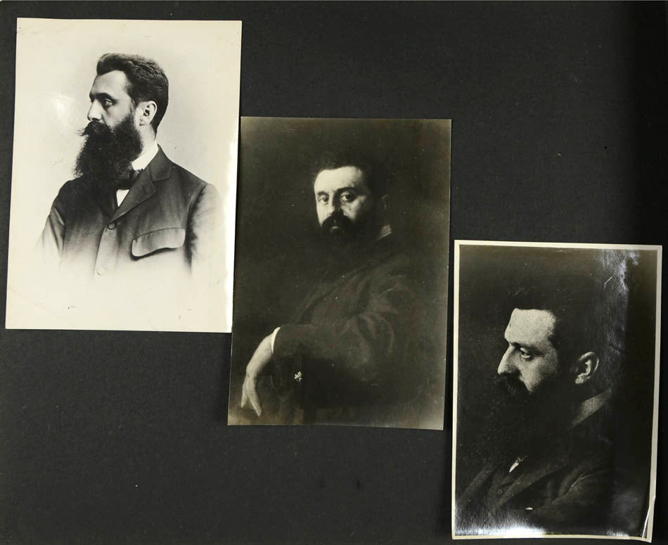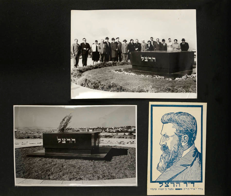 Album 1: 26 photographs and postcards of Herzl, his family and fellow Zionists.Album 2: Photographs, postcards, magazine clippings, 2 small brass reliefs showing Herzl, his family, the Zionist congresses and related scenes arranged in an album (65 items in total).
