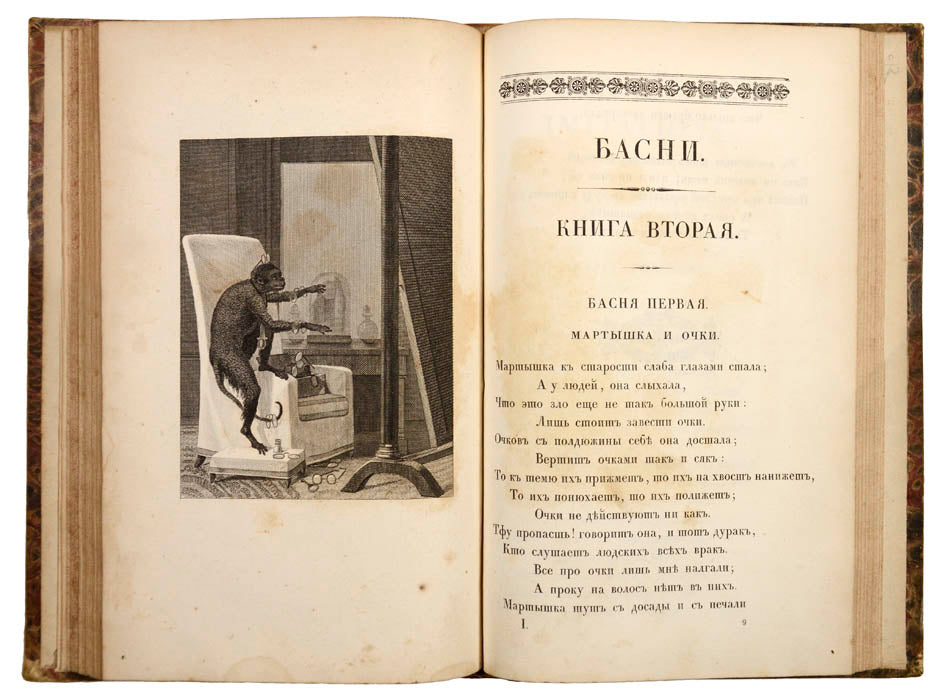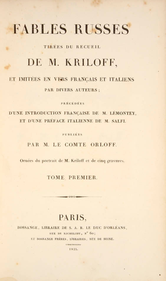 Provenance: Contemporary inscription on a paper, pasted on upper pastedown by a 'close friend of Bourdeloy de Bourbon, one of the translators of the fables'; above is pasted a cut-out from a newspaper with an obituary reporting the Krylov's funeral (1844).