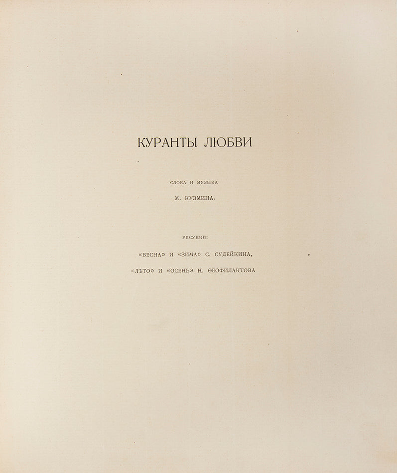 First edition; 4to (27.5 x 23.5 cm); text and music by Kuzmin, four phototype plates printed on strong wove paper, and four full-page illustrations, by N. Feofilaktov and S. Sudeikin, Сyrillic ownership inscription 'A. Artsikhovskiy' in pink ink to upper flyleaf; decorative coloured silk boards, silk frayed at spine and edges;