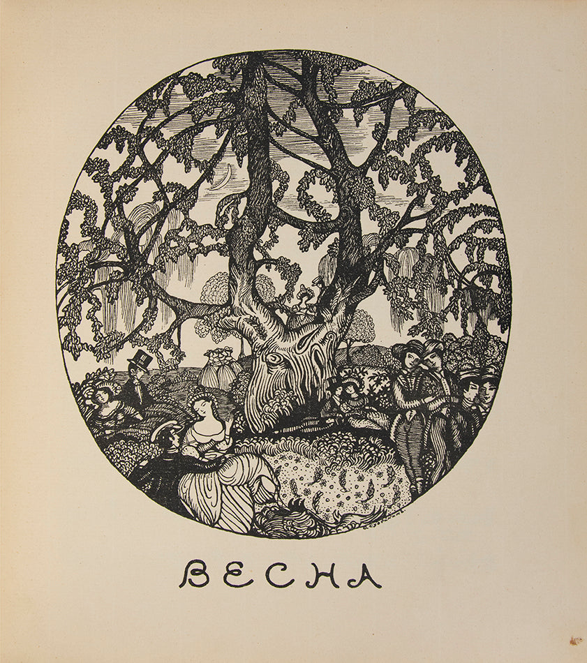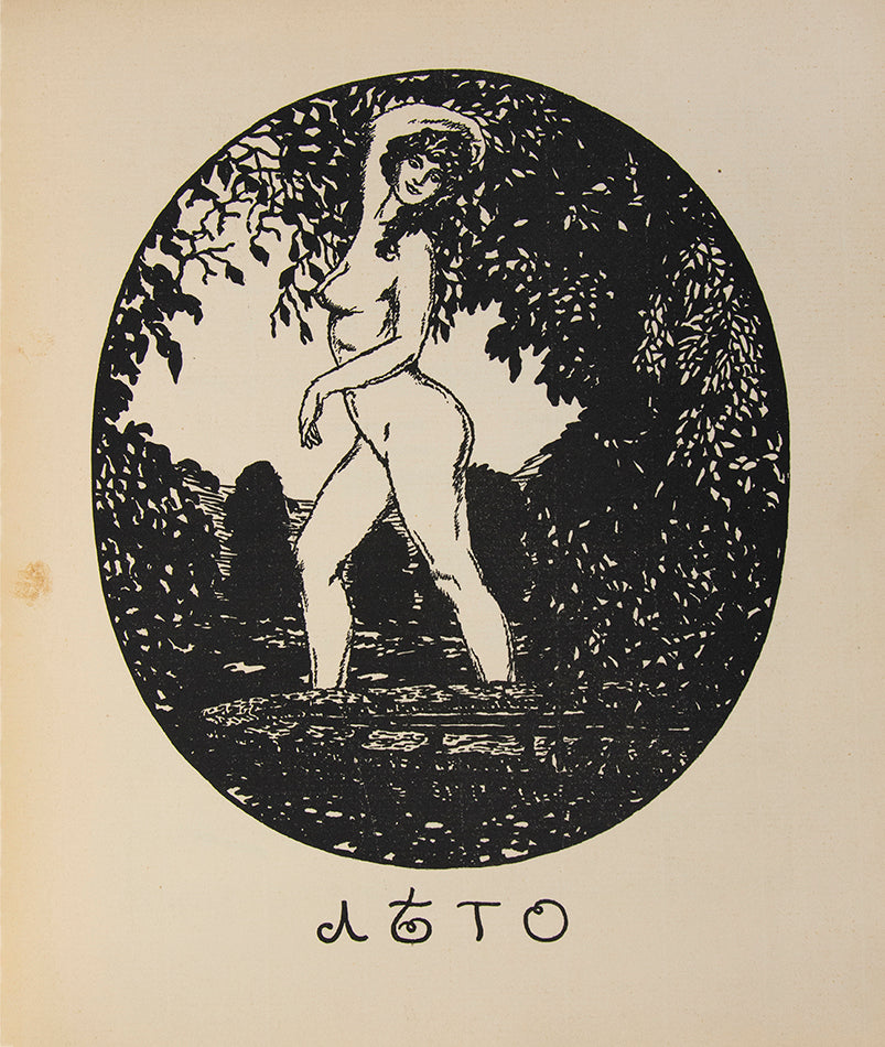 A rare music score composed by Kuzmin (who was known predominantly as a poet) with the addition of wonderful illustrations by 'World of Art' members, Sudeikin and Feofilakatov.Feofilakatov was strongly influenced by the drawings of Aubrey Beardsley and was even given the nickname 'The Moscow Beardsley'. He was a fervent admirer of Kuzmin's work and provided the artwork for the cover of Kuzmin's novel Wings, the first Russian homoerotic novel. Kuzmin and Sudeikin were in fact lovers and lived together with Sudeikin's wife, who threw Kuzmin out when she realised they were having an affair. He did, however, become friends and collaborate with Sudeikin's second wife, Vera de Bosset who in turn, ended up marrying Stravinsky.