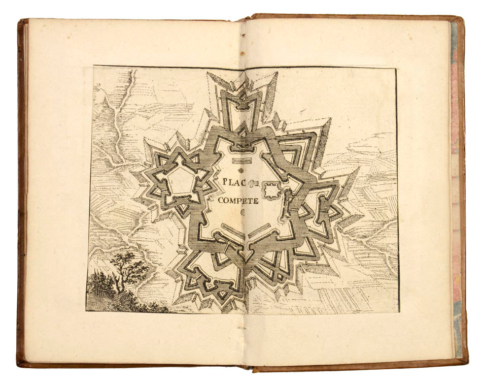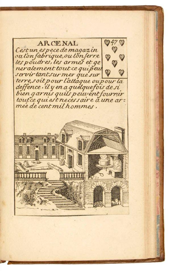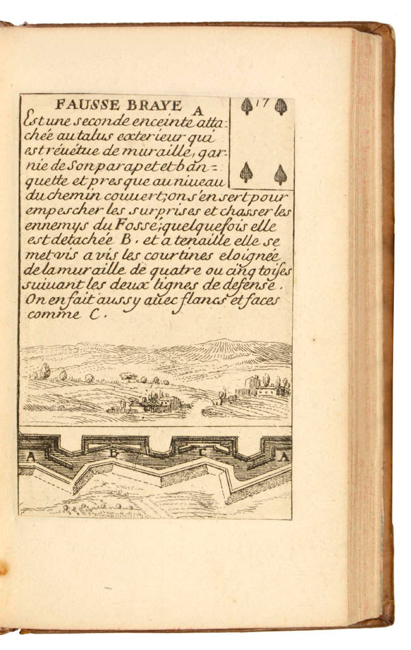 Given that the jeu de l'oie was very much in favour at the turn of the century, a new type of game appeared, mixing the latter with conventional playing cards. The jeu des fortifcations (like the similar jeu de la guerre, also invented by La Boissiere) is a prime example: originally issued on a broadsheet, it could be played either as a jeu de l'oie, with dice, or as a card game, in which each square could be cut out to form a deck of cards (as here). The original owner laid down the cut-out cards to form this lovely volume, leaving aside the title, the rules of the game and the table alphabétique that complete the broadsheet. It is rare to find the game in this condition, as once the cards were cut out they were only very occasionally kept in a volume.