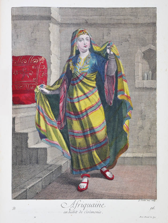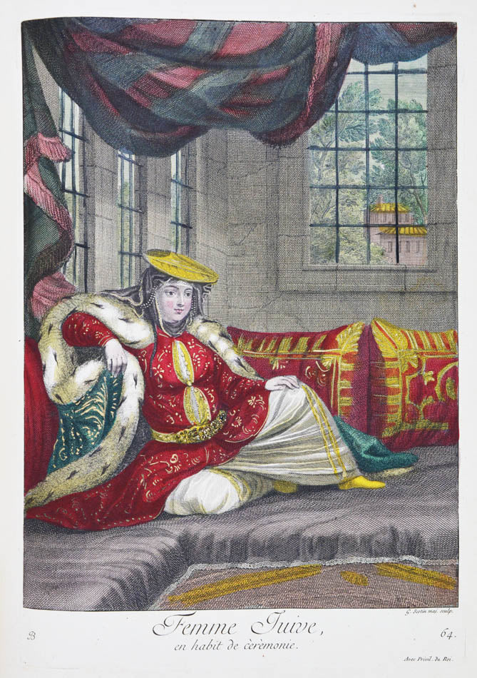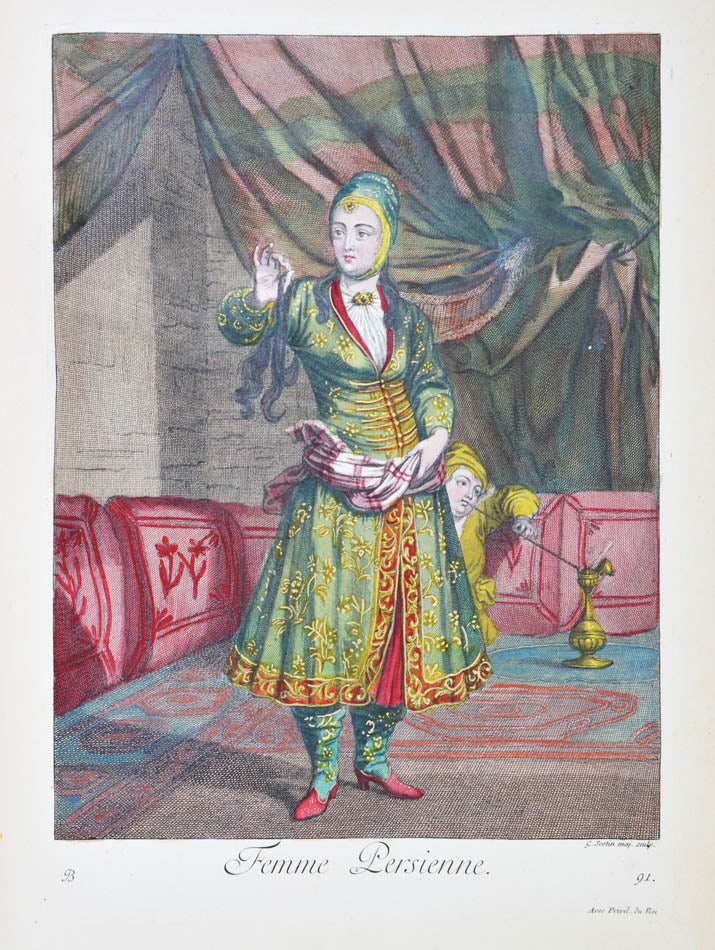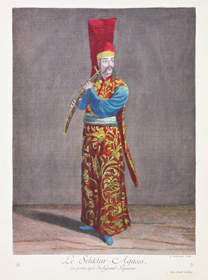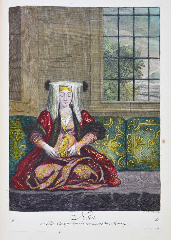 An exceptional example. Most copies were issued uncoloured. A few were sold with hand-colouring and a smaller number were issued heightened with gold and mica. Very few copies, however, have as many engravings heightened with mica as the present one.This important work forms the 'basic prototype for Levantine costume plates' (Atabey). The most luxurious edition, with hand-coloured plates, many enhanced with gold and mica, arguably the finest colour plate costume book of the Ottoman Empire. In addition to the sixty or so plates depicting Turkish Court, noble, military and other costumes, the work illustrates the regional, religious or national costume of several other parts of the Turkish Empire. These include Greeks (10); Albanians (2); Jews (3); Hungarians (2); Wallachians (3); Bulgarians (2); Crimean Tartars (1); Armenians (5); Persians (2); Indians (2); Arabs (1); Barbary Coast (4); and Moors (1).