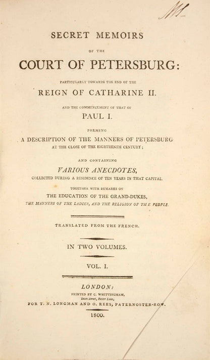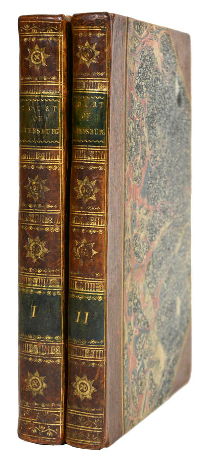 A very good copy of the first English edition,'Serving as a supplement to the Life of Catharine II'. As the title page indicates, the subject covered is broad but mainly focused on the court history: 'containing various anecdotes, collected during a residence of ten years in [the] capital. Together with remarks on the education of the grand-dukes, the manners of the ladies, and the religion of the people'.