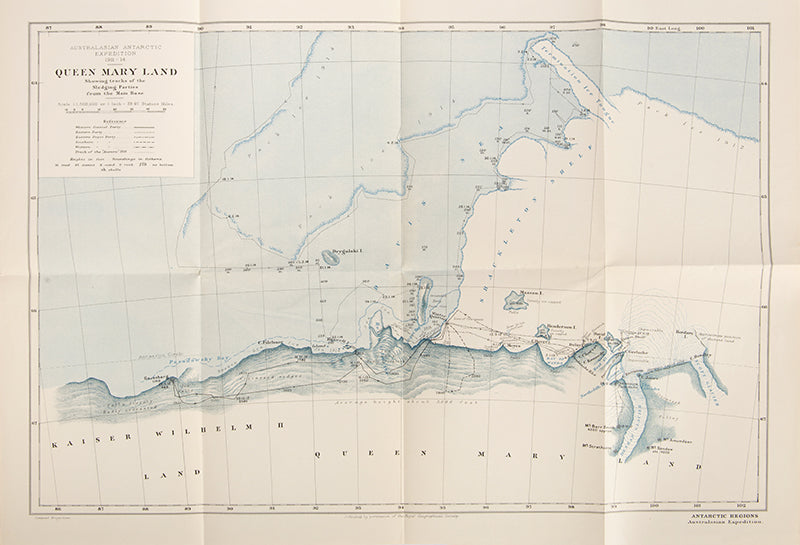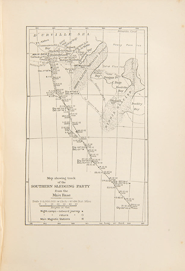 inscribed on the first blank: Mr. Delprat / With kind regards from / Douglas Mawson / 1916. The recipient, C.C. Delprat (1853-1934) was the paternal uncle of Mawson's wife Francisca Adriana ('Paquita') Delprat. She married Mawson in 1914, shortly after his return from his Antarctic Expedition.rare inscribed copy of the first edition of Mawson's 'classic account of 'heroic age' exploits' with 'stunning photography' (Taurus). Sir Douglas Mawson (1882-1958), a former companion of Shackleton on the Nimrod expedition, visited the almost unexplored regions of King George V Land and Adelie Land, charting about two thousand miles of coastline from 1911 to 1913.