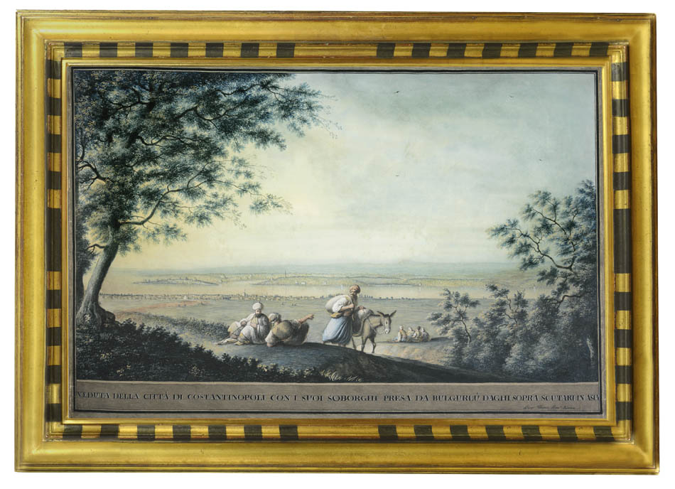 A fine watercolour view of Constantinople taken from Bulgarlu above Scutari, in the foreground two men smoking, another walking past with a donkey, a group of four men looking towards the city, the composition framed by trees.