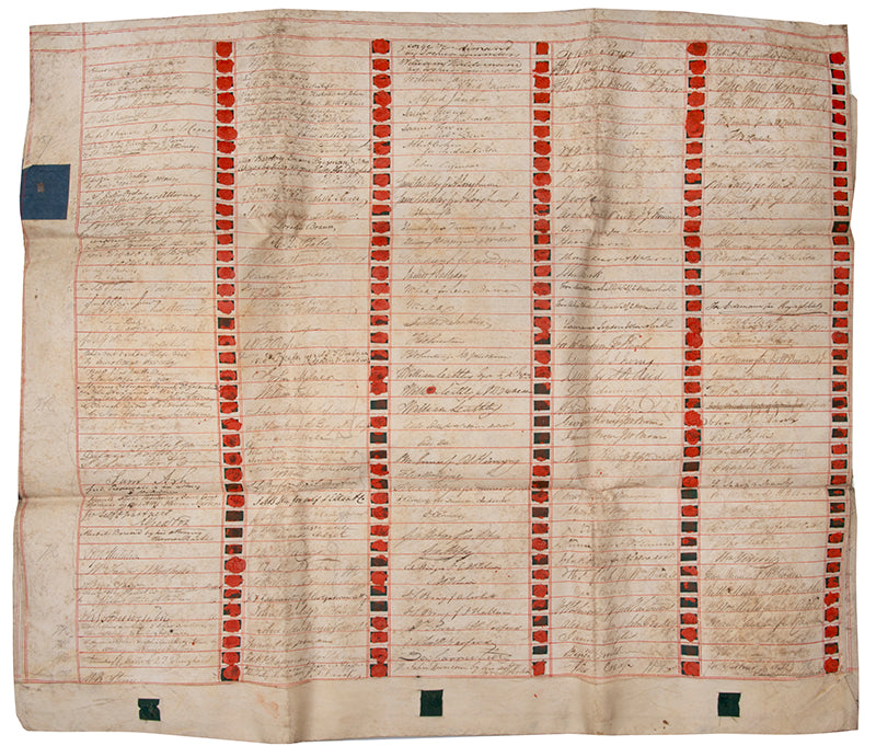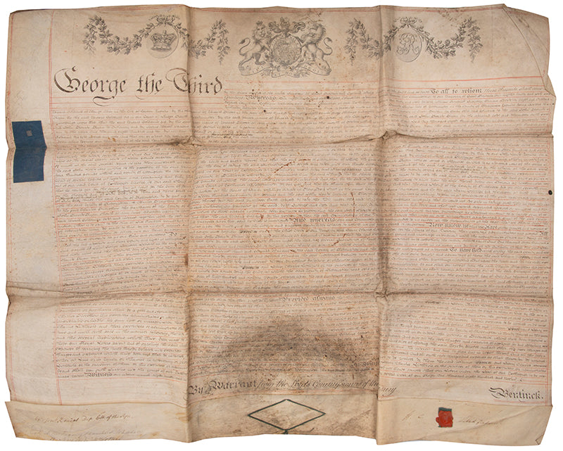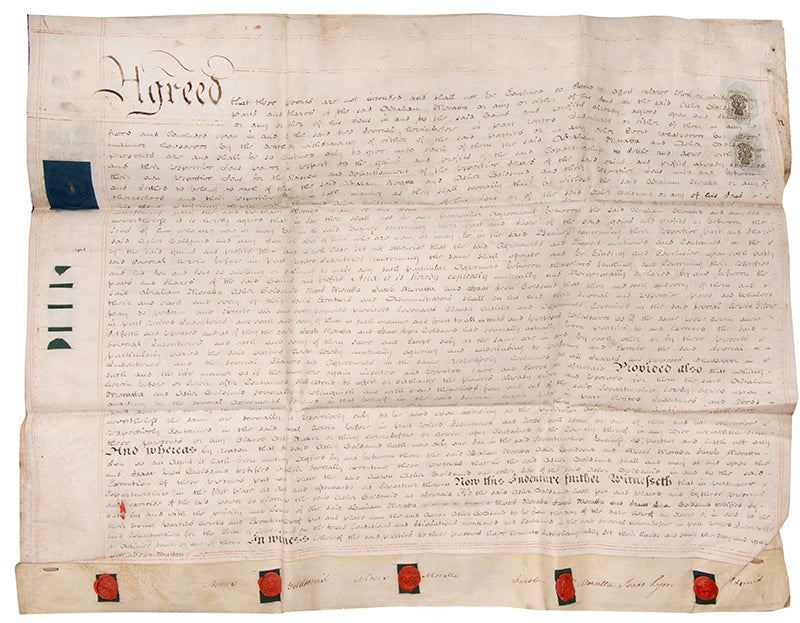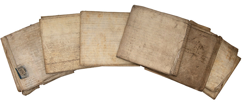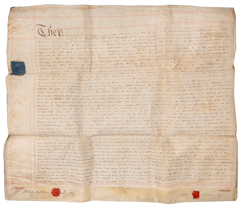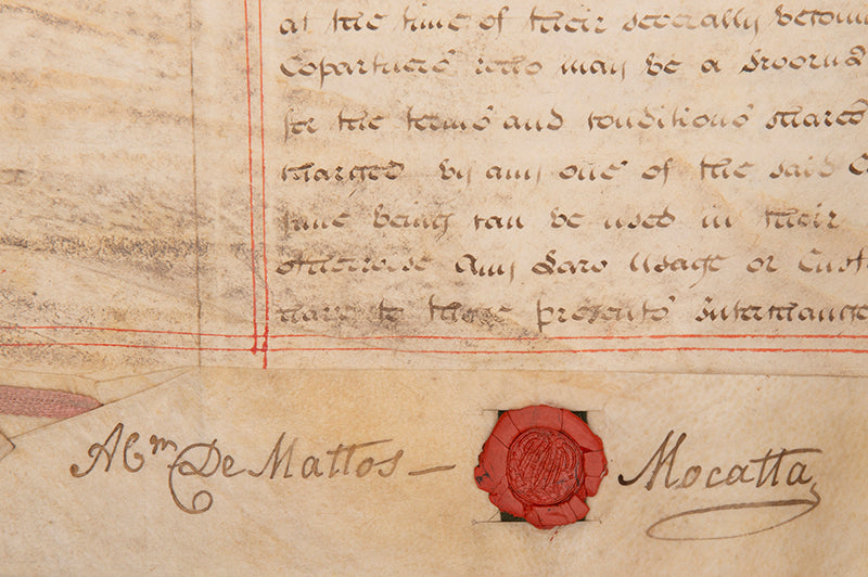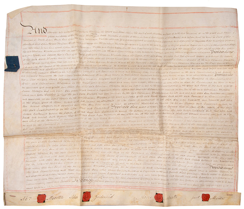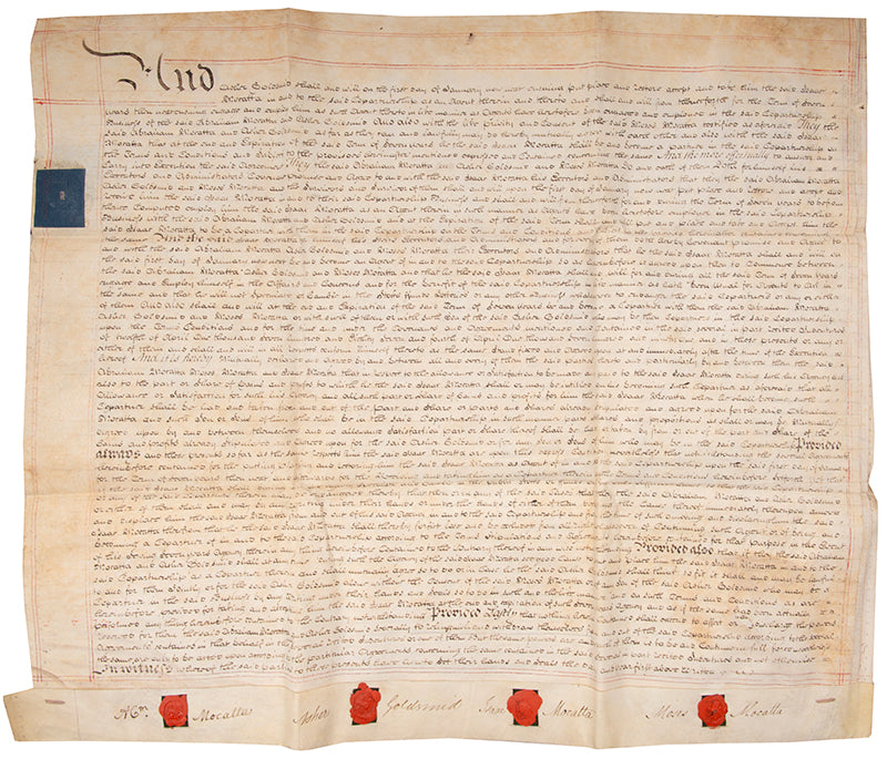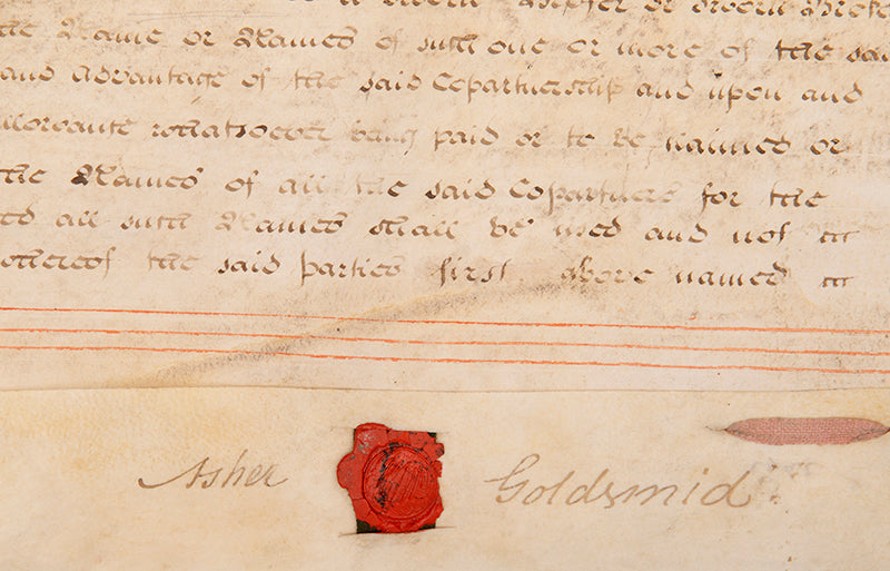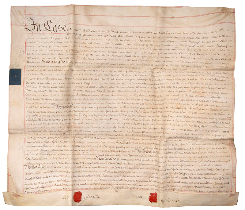 Seven documents containing multiple vellum sheets (approx. 53 x 68 cm), occasional holes and light wear; (1) articles of copartnership for Abraham Mocatta and Asher Goldsmid dated 12th April 1787; (2) agreement dated 4th April 1791 appointing Abraham's son Moses Mocatta an agent of the copartnership; (3) articles dated 31st December 1792 appointing Moses a copartner; (4) articles dated 2nd September 1793 appointing Abraham's son Jacob Mocatta an agent; (5) articles appointing Jacob and Asher's son Isaac Lyon Goldsmid copartners dated 31st March 1800; (6) grant by letters patent of an equity of redemption dated 18th April 1812; and (7) deed between B.A. Goldmschmidt & Co. and their creditors dated 28th August 1826.