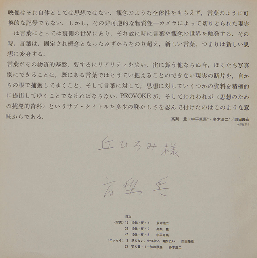 Provoke / Purovoku: shisho no tame no chohatsuteki shiryo kikan dai 2-go [Provokative Materials for Thought. Quarterly. No. 2]; Provoke / Purovoku: shisho no tame no chohatsuteki shiryo kikan dai 3-go [Provokative Materials for Thought. Quarterly. No. 3]; [with] Amano Michie. Mazu tashikarashisa no sekai o sutero. Shashin to gengo no shiso [First, Abandon the Realm of Verisimilitude. Thoughts on Photography and Language].