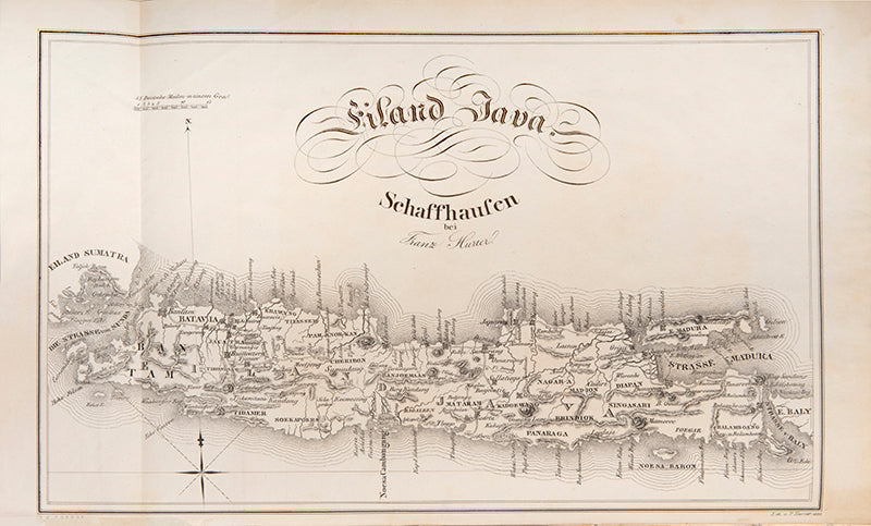 The copy of Sir Thomas Phillipps (1792-1872), notorious bibliophile, with his manuscript index number to front pastedown. A bright set of these magnificent lithographs of Javanese costume, topography, weapons, and coins. The folding map shows the whole of Java. The work was originally published in parts.Josef Jakob Xaver Pfyffer zu Neueck (1798-1853) was a Swiss officer in the Netherlands Indies Army between 1819 and 1827. His description of the island and its various inhabitants is an important work on the cultural history of Java due to his precise observation and clear depiction of the conditions of the Javanese peoples.