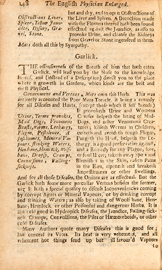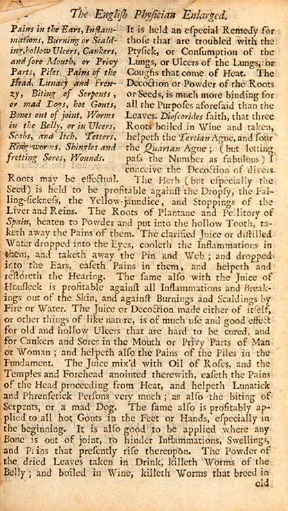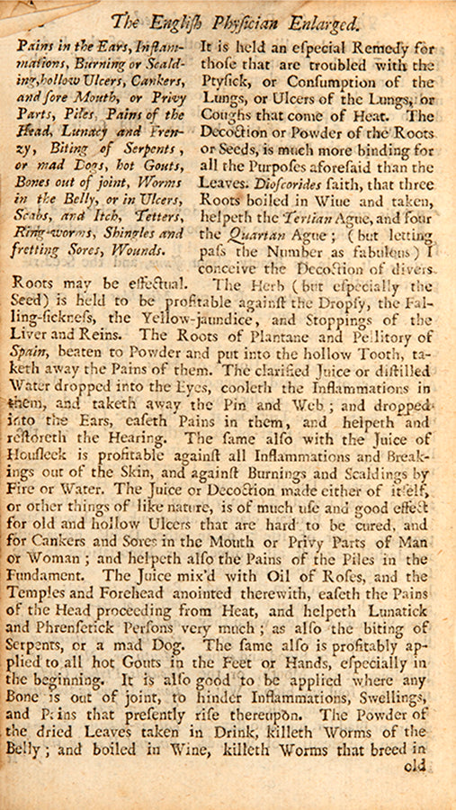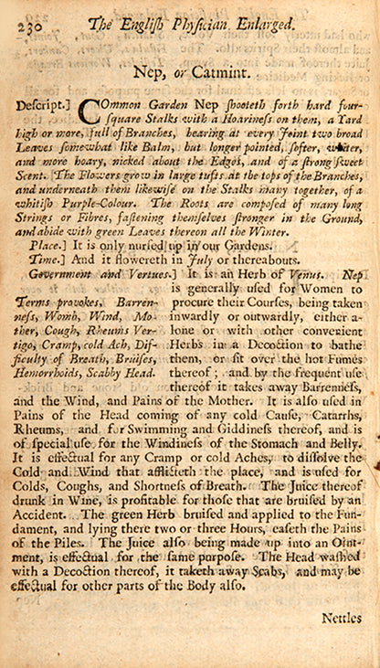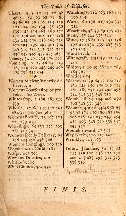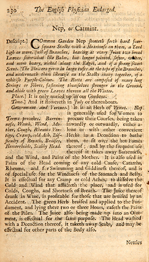 There was certainly great interest in regulating menstruation and reproductive health among both women and male physicians, as indicated by the use of this copy. The manuscript line on women's courses on the rear endpaper precisely matches a line from the index on the facing page, which directs the reader to a list of 26 pages relevant to 'stopping the terms' and 29 for 'provoking' them. A number of leaves of the text have been dog-eared, some corresponding to information on menstrual afflictions. For instance, the marked page on nettle describes a decoction of the leaves in wine as 'singular good to provoke Women's courses, and settle the Suffocation, strangling of the Mother, and all other Diseases thereof; as also applied outwardly with a little Myrrh' (p. 231). Darnel (a toxic mimic of wheat) 'stayeth... women's bodily issues' and mustard 'is of good effect to bring down women's courses'. Hops 'bringeth down women's courses', and horehound on the following page 'is given to women to bring down their courses' (these marked by an extra-large flap, perhaps to indicate multiple relevant pages). Some leaves that show evidence of old folds are also connected to women's health: alkanet (a type of borage) 'draws forth the dead child'.