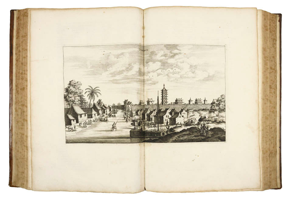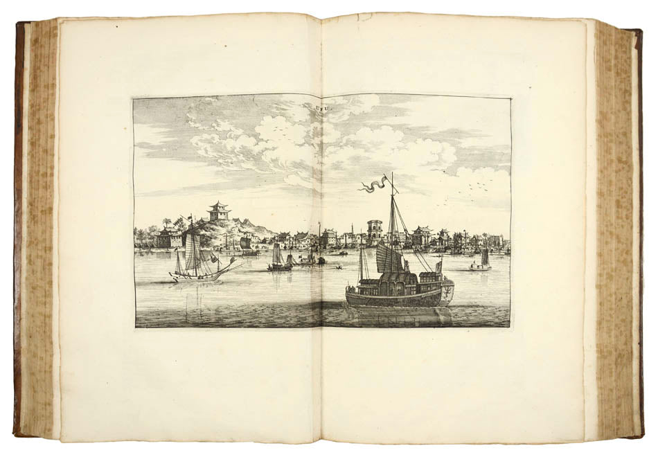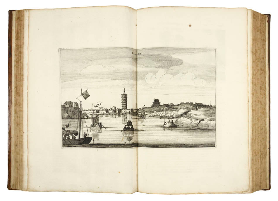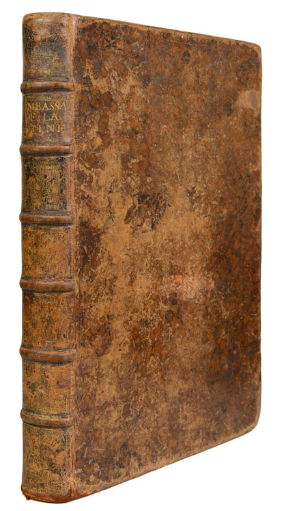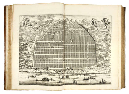 First French edition. Folio. 2 parts in 1, bound without additional engraved title, printed title printed in red and black with engraved vignette (short tear to lower blank margin), engraved portrait of Colbert, large folding map (short tear to fold, lightly browned), 34 double-page engraved plates, engravings in the text, light old waterstain towards end, contemporary mottled calf gilt, joints and extremities neatly repaired, a little rubbed, a very good copy.