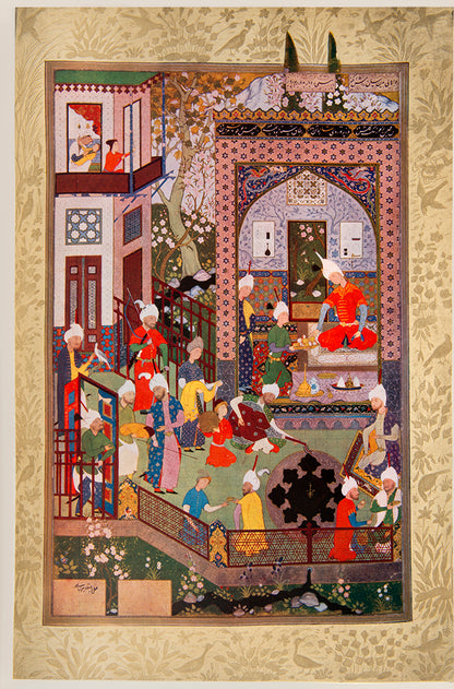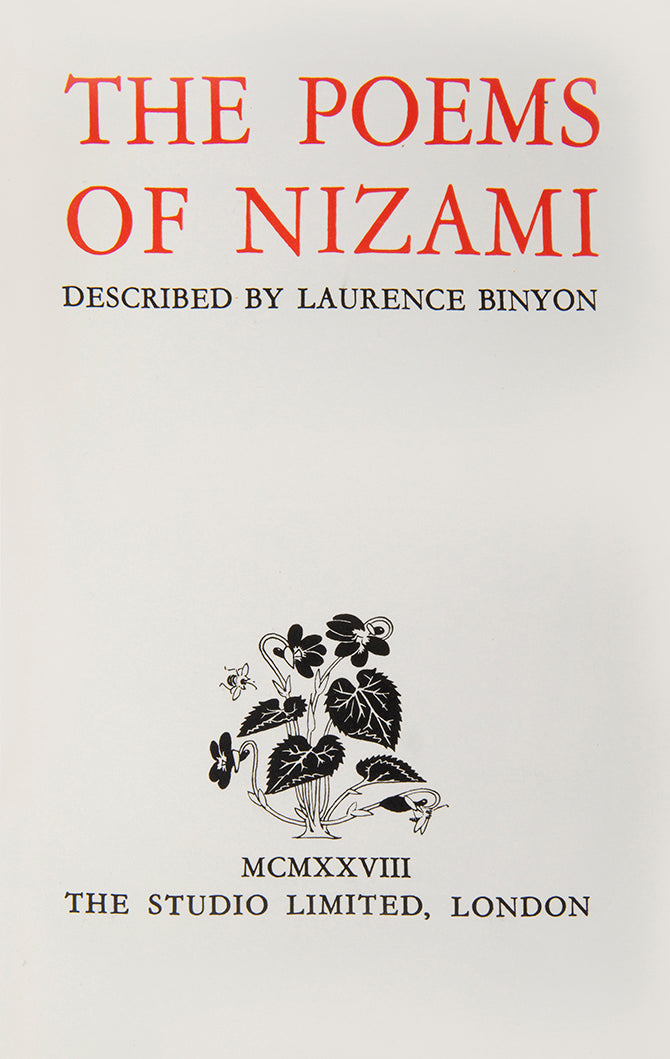 A very fine publication, likely printed for private circulation among trustees of the British Museum, featuring full-page facsimile reproduction paintings from the Shah Tahmasp Khamsa of Nizami. The text by Laurence Binyon provides details about the manuscript, Shah Tahmasp and his painters, painters in Persia, the life of Nizami and descriptions of each of the five poems. The illustrations present feature reproductions of important sixteenth-century artists, including: Mirak, Mirza Ali, Sultan Muhamad, Mir Sayyid Ali and Muzaffar Ali.