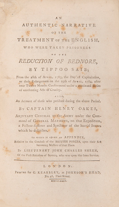 The first edition of Henry Oakes' (1756-1827) eyewitness account describing the treatment of prisoners following the capitulation of the British garrison at Bednore in 1783.