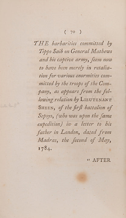 Interestingly, the publisher goes some way to redress the imbalance of Oakes' narrative, reproducing the letter from Lieutenant John Sheen to his father dated 2nd May 1784 which describes the brutal British capture of the fort at Annampore earlier in the year. Instructed to give no quarter, the young officer recalls how 'four hundred beautiful women [were] either killed or wounded with the bayonet, expiring in one anothers arms, while the private soldiers were committing every kind of outrage'. Viewed in this light, the treatment of Oakes and his fellow soldiers is seen as 'retaliation for the various enormities committed by the troops of the Company' (pp.77-78), and readers are left to make up their own minds in apportioning blame and sympathy for the dead.