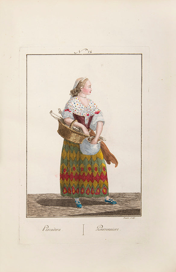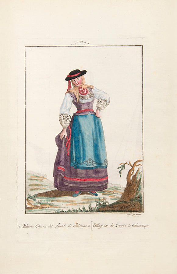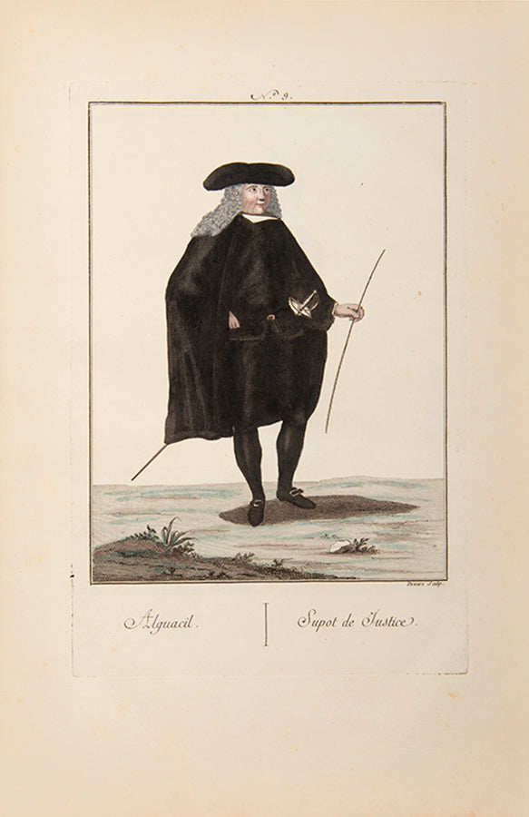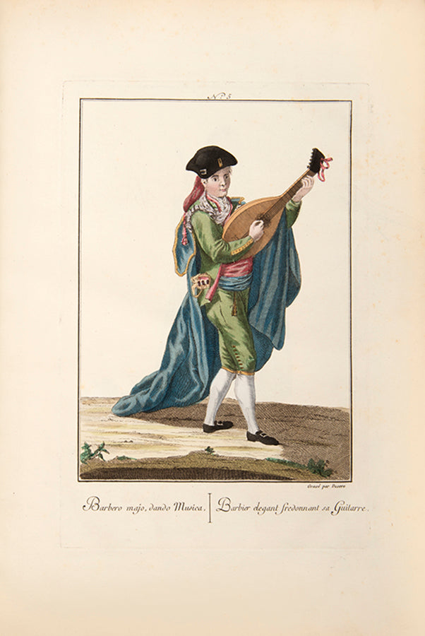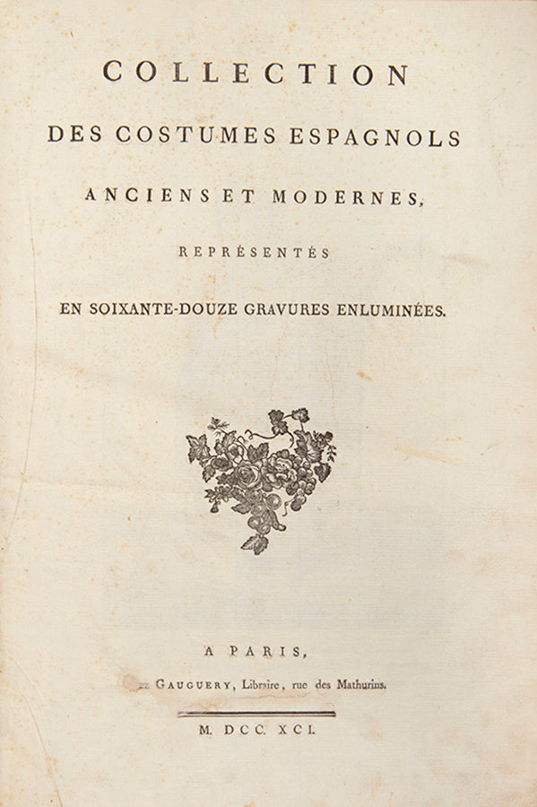 First French edition of Cruz Cano Y Olemedilla's popular Spanish work, with 72 hand-coloured plates.The collection of costume plates was intended to record the different outfits worn by the Spanish people, both common and noble, stretching across all the different regions of the country and accounting for all of its colonies. Cruz Cano Y Olemedilla (1734-1790), a Spanish engraver and cartographer, was sent by the state to study architectural engravings in Paris in 1752. During this time he also learnt the art of map engraving under the great French geographer Jean Bapriste Bourguignon d'Anville (1697-1782). His background and training in France can be appreciated in this suite of costume engravings; the topographical and architectural details included in the plates provide further insight into the customs and the geographical features of the various depicted towns and cities.