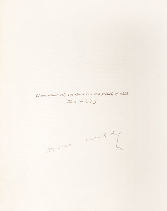 Deluxe first edition of Wilde's only novel, this being number 225 of 250 copies signed by the author. The Picture of Dorian Gray is the story of a decadent young man who trades his soul for eternal youth and beauty. It was published first in Lippincott's Monthly Magazine in 1890 before being expanded and published in book form in 1891. The story was heavily edited at various stages in its publication history to remove queer content which offended British sensibilities (and the law). Even bowdlerized, the book was used against Wilde at his trials, eventually resulting in a prison sentence for 'gross indecency.' This large paper 'edition de luxe' was published in July 1891, three months after the first trade edition.Deluxe first edition, number 225 of 250 large paper copies, signed by the author; 4to (21.8 x 18 cm); title page variant with period after 'Gray', unmarked internally; bound in handsome 1920s crushed morocco by Morrell, gilt-tooled covers imitating the original design, the front cover with 55 stylised 'butterflies' after the original by Charles Ricketts, top edge gilt, others untrimmed, original covers and spine bound in, spine a little faded, light rubbing to spine and corners, otherwise very good indeed.
