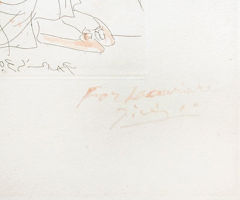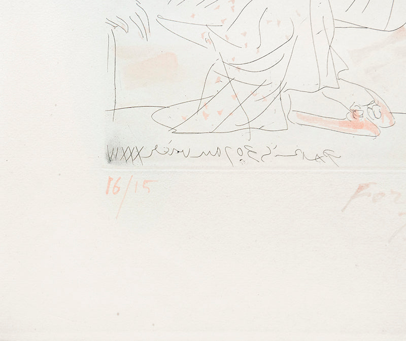 A rare etching, extensively hand-coloured in red ink by the artist, 1934, on wide margin Montval laid paper, signed, inscribed 'For Lacourière' and numbered 16/15 in the same red ink, 46 x 35.2 cm. (18.1 x 13.8 in). Brigitte Baer states that Picasso signed and numbered 15 impressions of this work in red ink, she then cites this special hand-coloured 16th impression which was given by the artist to Roger Lacourière in her catalogue raisonné of Picasso, 'Painter-Engraver Volume II'._x0000_