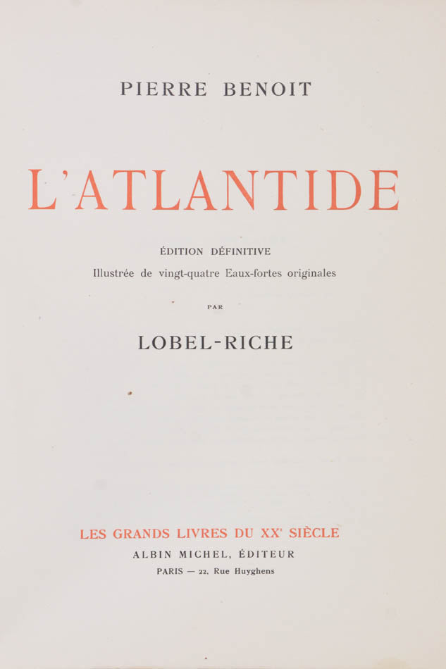 L'Atlantide was originally published in 1919 and shortly became a huge success, winning the Grand Prize of the Academie Francaise the same year. Its popularity was largely attributed to the welcome escape Benoit's passionate and exotic novel gave to those suffering from the horrors of WWI.