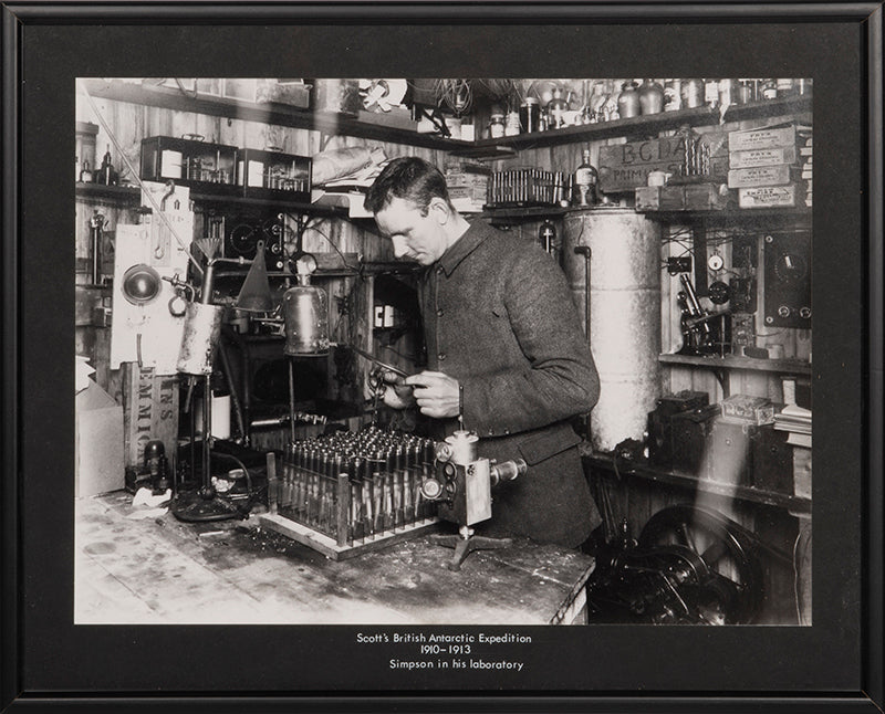Classic Ponting photograph from Captain Scott's Terra Nova expedition (1910-1913), showing George 'Sunny Jim' Simpson, the expedition's meteorologist, filling standard cells in his laboratory (known as Simpson's Corner) in the Hut at Cape Evans. He became Director of the Met Office in 1920, retiring in 1938, having been knighted in 1935.