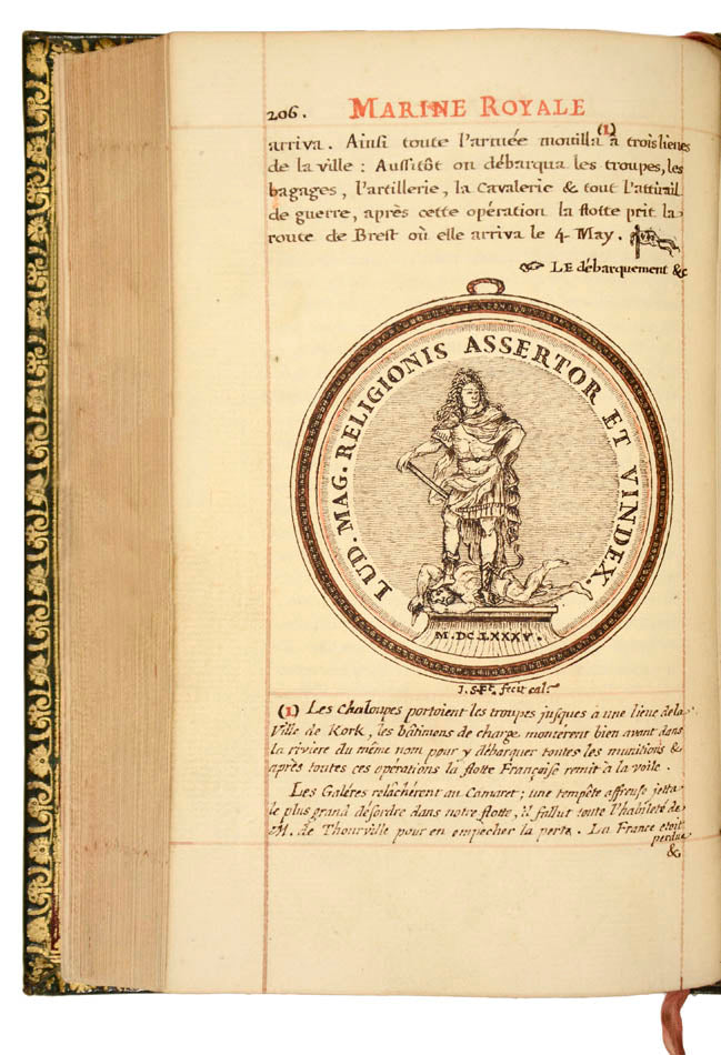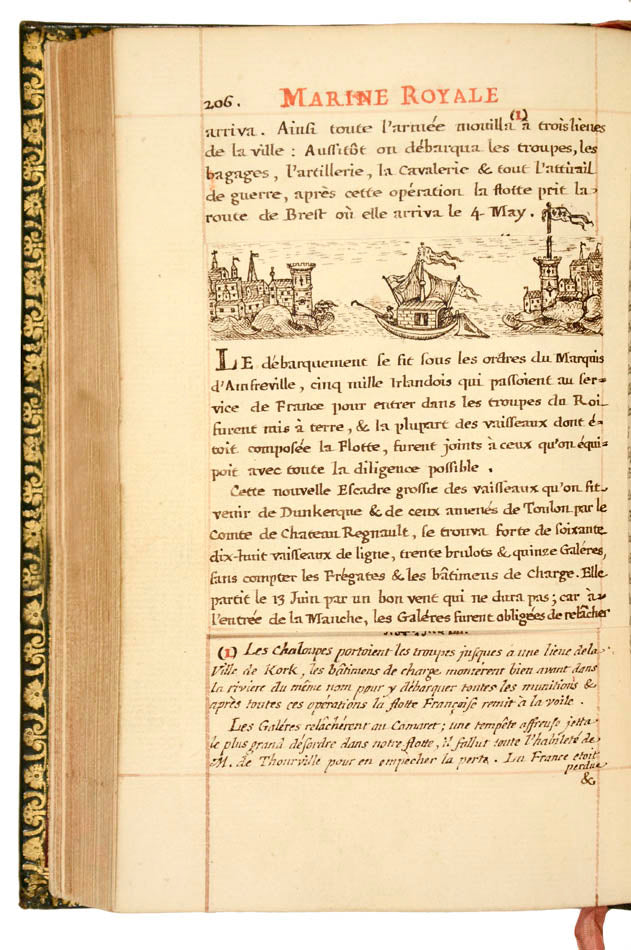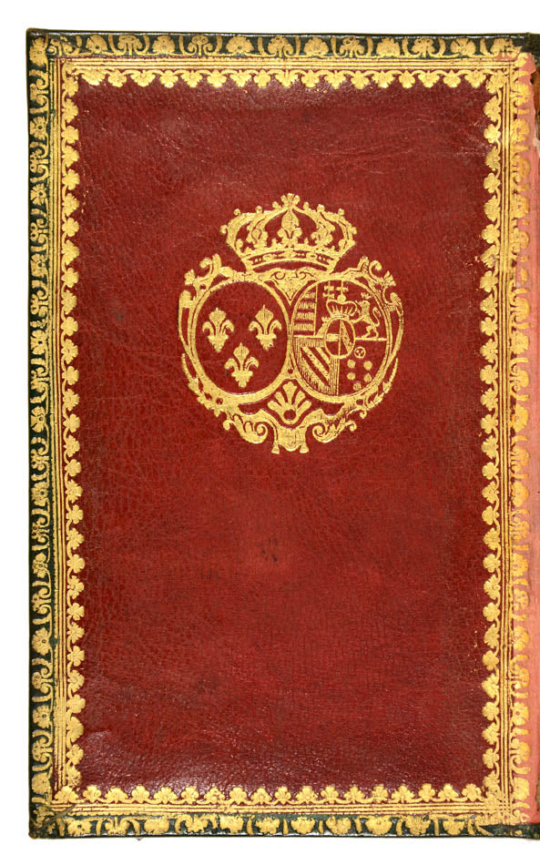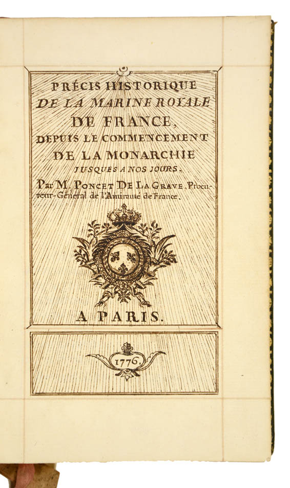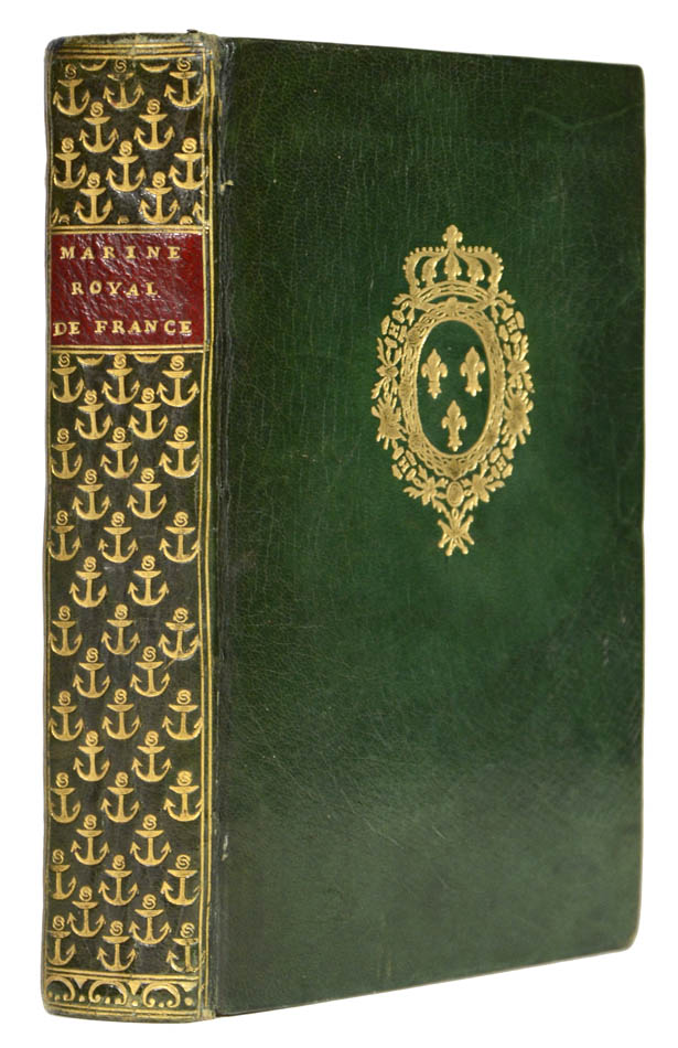 8vo (16.7 x 10.8 cm). Calligraphic manuscript on paper in the style of a printed book. pp. [10], v, [3], 394, xxii, [10], signed at end of the Dedication to the King, 'Poncet delagrave,' all leaves ruled in brown and red inks, one full-page portrait and one half-page medallion portrait, several elaborate head-pieces, tail-pieces, initials and ornaments, ms. slip to page 206 bearing a maritime subject drawn by pen overlaying a medallion representing Louis XVI with the inscription 'Lud. Mag. Religionis Assertor et Vindex'; original green morocco, gilt-stamped arms of Louis XVI on covers, red morocco doublures with gilt-stamped arms of Marie-Antoinette, flat spine decorated all over with gilt-stamped anchor ornaments, red morocco lettering label, gilt-filetted board edges, pink watered silk linings, all edges gilt, housed in later green morocco pull-off case.