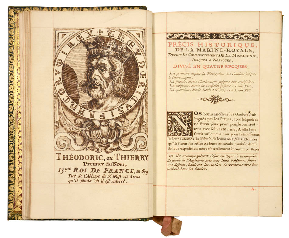 The text, a history of the French Navy from its inception to the time of Louis XVI, is the same as that published in Précis historique de la Marine Royale de France, depuis l'origine de la monarchie jusqu'au Roi régnant (Paris, Eugene Onfroy, [1780]). The published edition is in two volumes and without illustrations, and includes a different dedication (to Monseigneur de Sartine, Ministre et Secrétaire d'État au Département de la Marine) and preface. There is an index at the end of each volume.