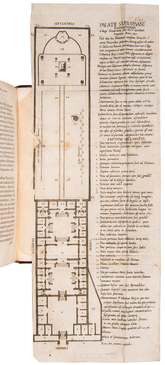Second edition in Latin. 4to, (21.3 x 15.5 cm); [16], 628, [10] pp. (pp. 626-628 misnumbered as 606-608); engraved title page including a map of China, folding letterpress plate with woodcut diagram (repaired with minor loss), faint damp-staining to first five leaves, Contemporary blind-stamped calf, raised bands, carmine edges, expert restoration to corners and edges, a very good copy.