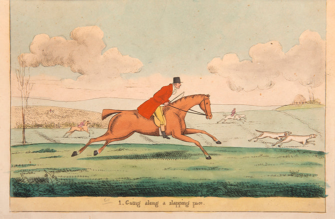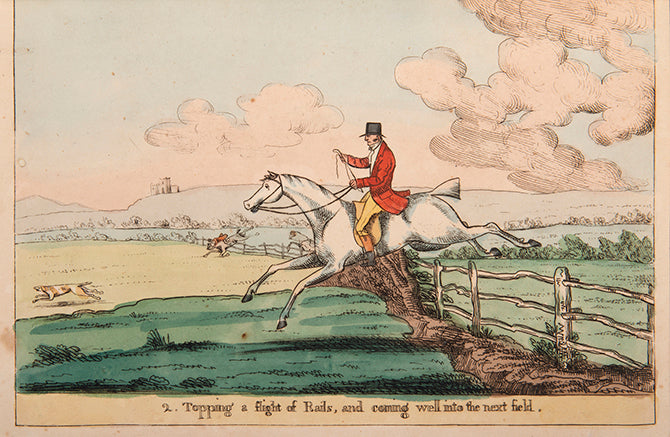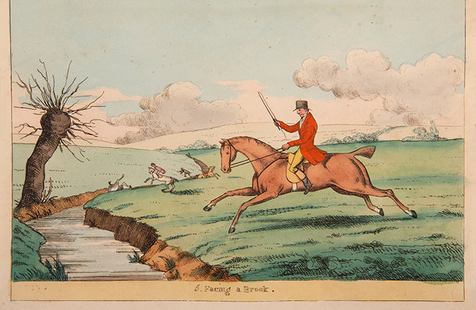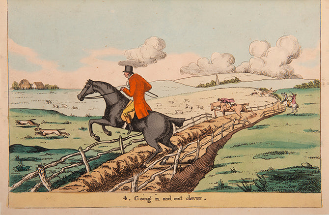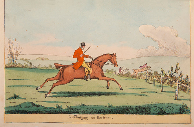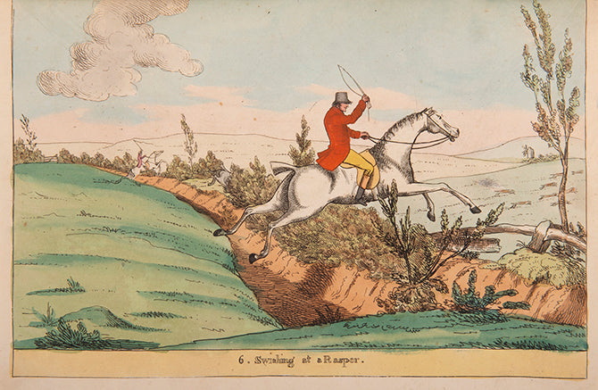 The plates are captioned: "Going along a slapping pace", "Topping a flight of Rails, then coming well into the next field", "Charging an Ox-fence", "Going in and out clever", "Facing a Brook", and "Swishing at a Rasper", all Indispensable Accomplishments for a good hunter. This set of plates prompted Henry Alken to publish his "Qualified Horses and Unqualified Riders..".