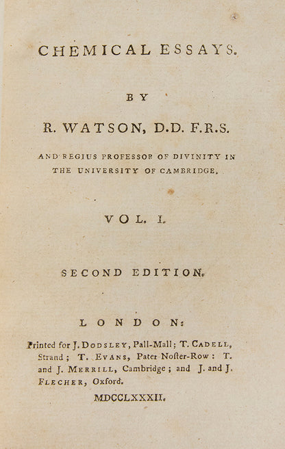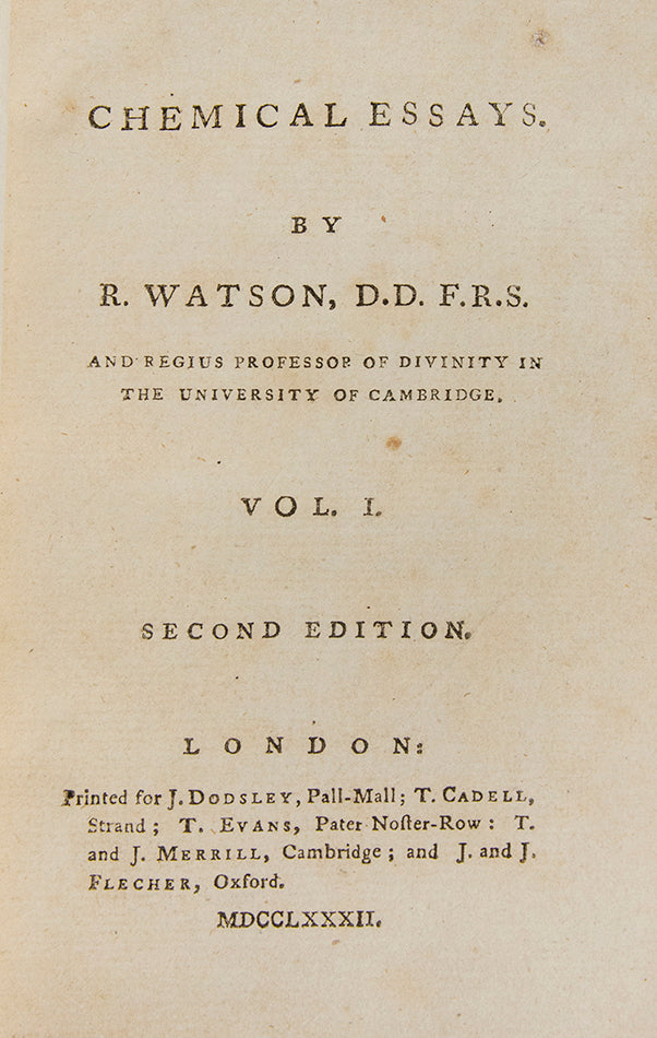 His 'Chemical Essays', published in five volumes from 1781-7, represent a lucid distillation of the subject by an intelligent layman, but with little original research. They do reveal, however, Watson's particular interest in applying science to manufacturing processes in an effort to realise Britain's industrial potential. Largely a self-made man, Watson believed in learning by doing, saying 'a man must blacken his own hands with charcoal, he must sweat over the furnace, and inhale many a noxious vapour, before he can become a chemist'.
