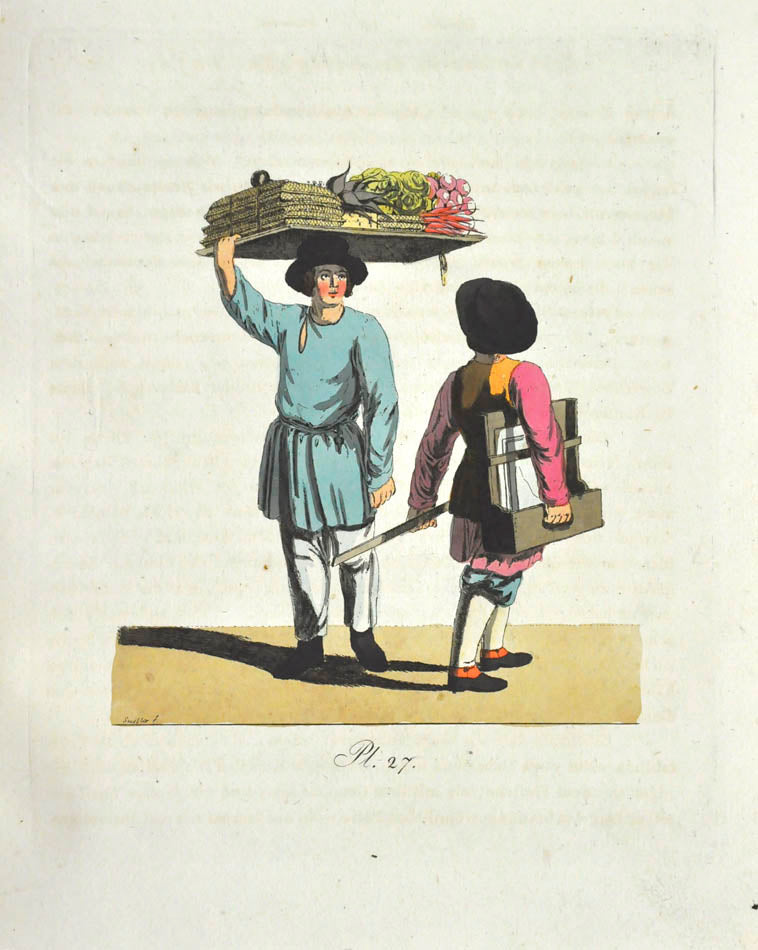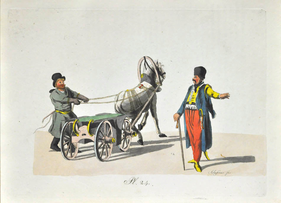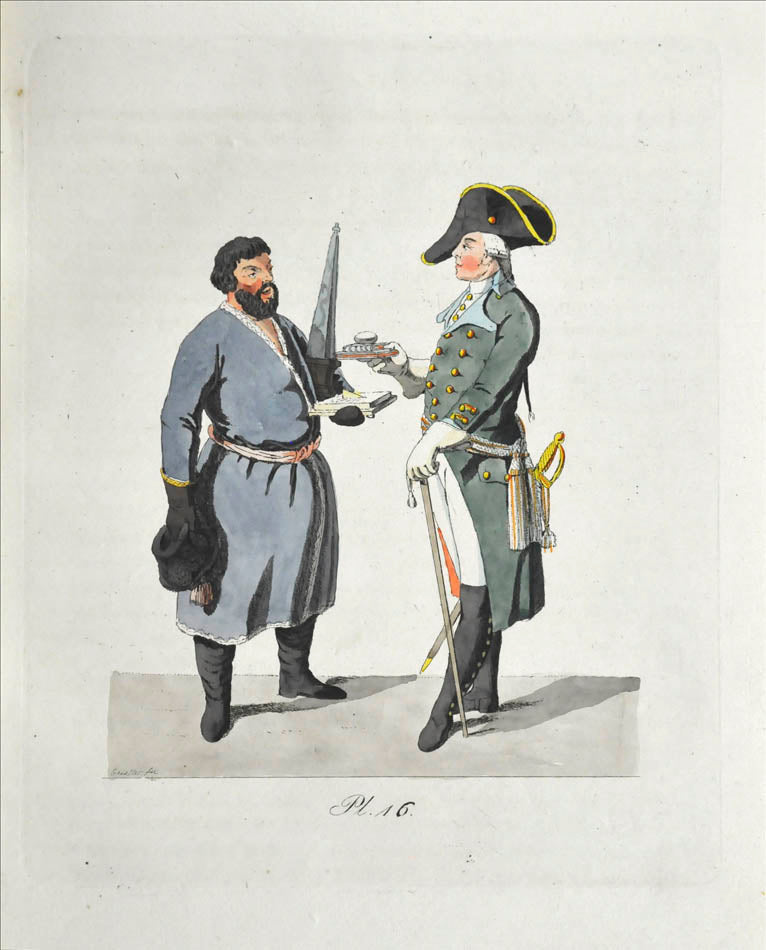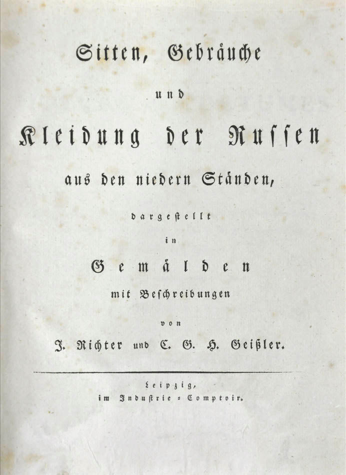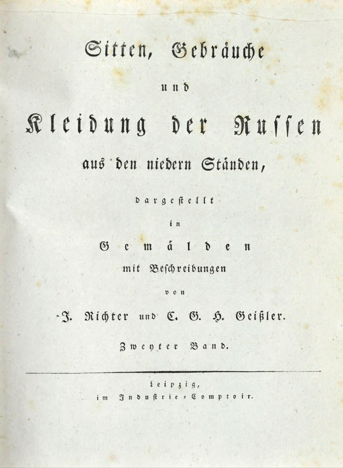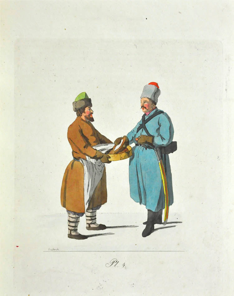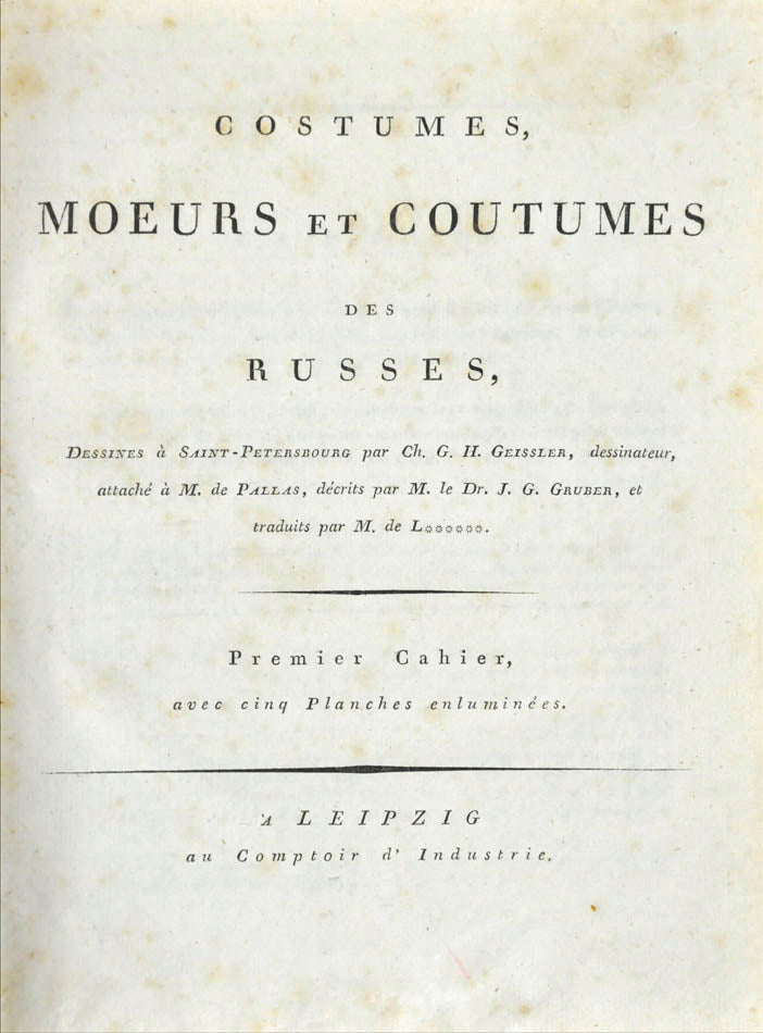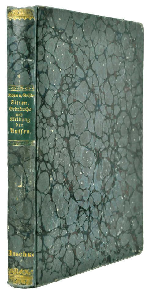 Fine, fresh copy of this important illustrated work on Russian habits and costumes.Christian Heinrich Geissler (1770-1844) was a famous German draughtsman who frequently worked for the Imperial court in Russia. Born in Leipzig, he quickly gained fame for his engravings of costumes and animated landscapes. After Geissler published a catalogue of Russian military uniforms enriched with 88 illustrations, the Imperial advisor Peter Simon Pallas offered his fellow countryman to join him on his expedition through Russia and the Caucasus with the role of illustrator and draughtsman. While Geissler spent most of the 1790s in Saint Petersburg, the expedition with Pallas took took him to the Southern Russia in 1793-1794 and resulted in the publication of several collections of engravings based on the sketches Geissler had made during his lengthy trip.