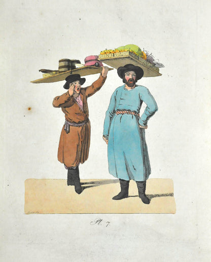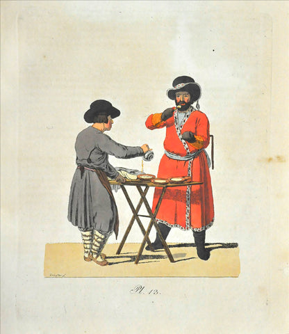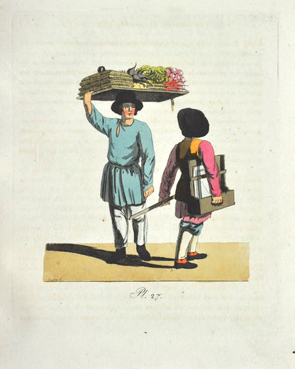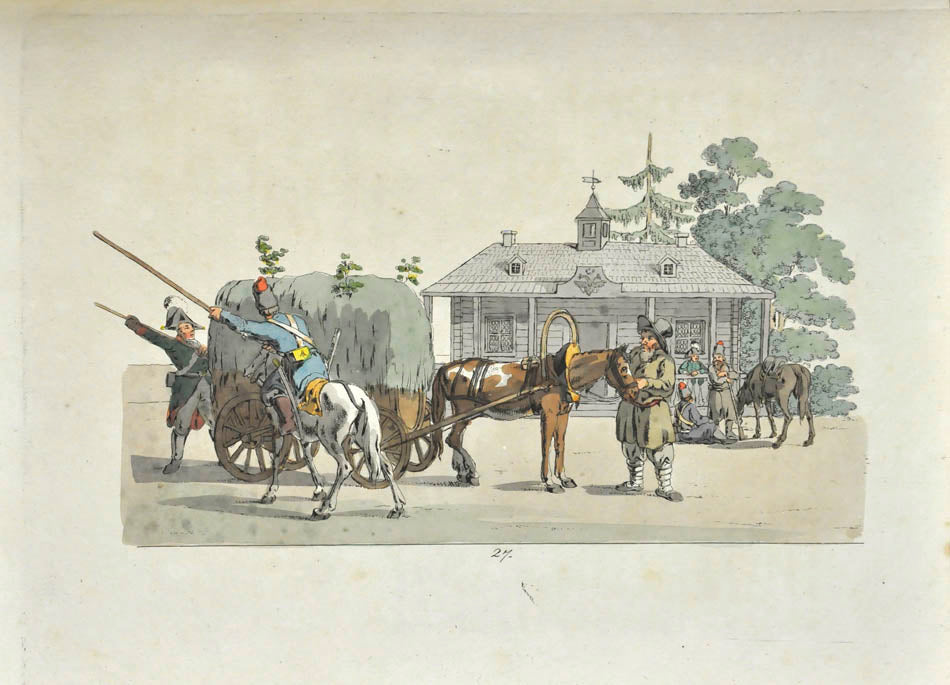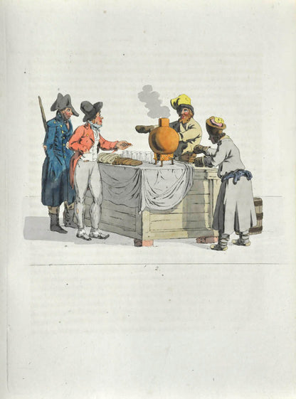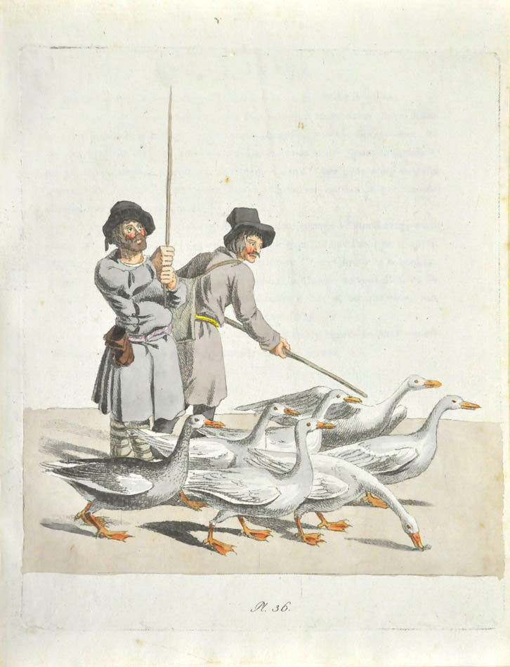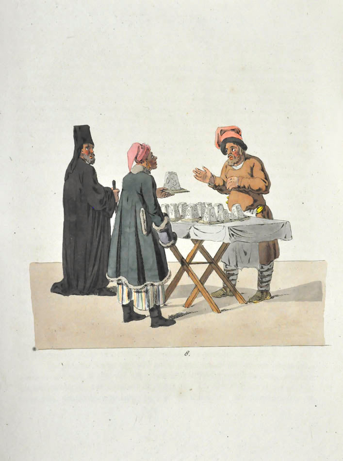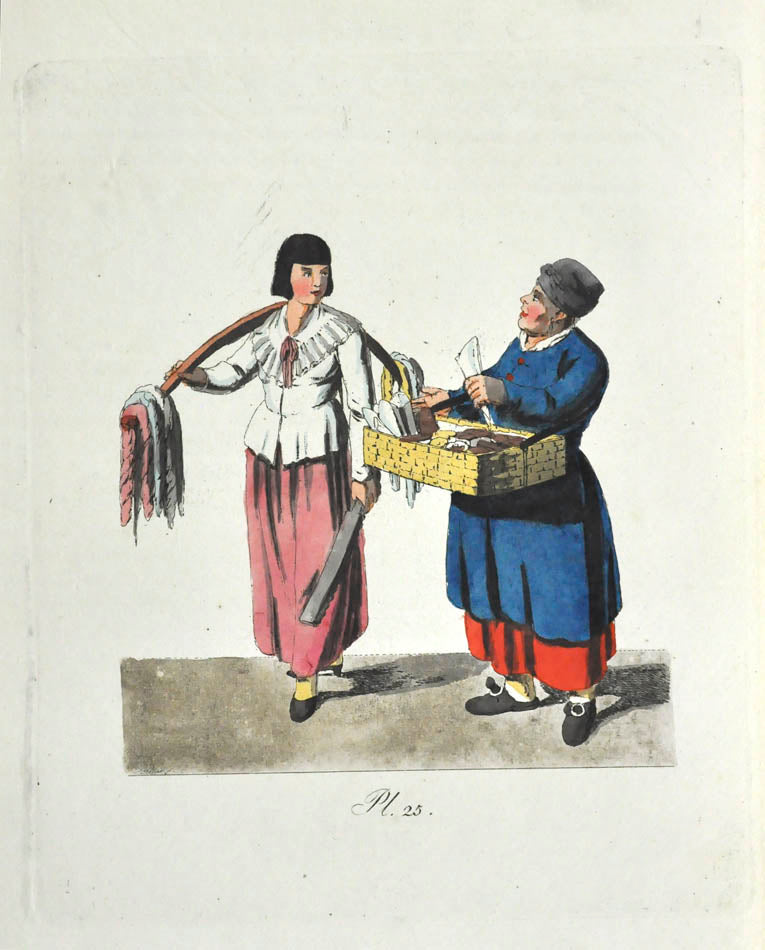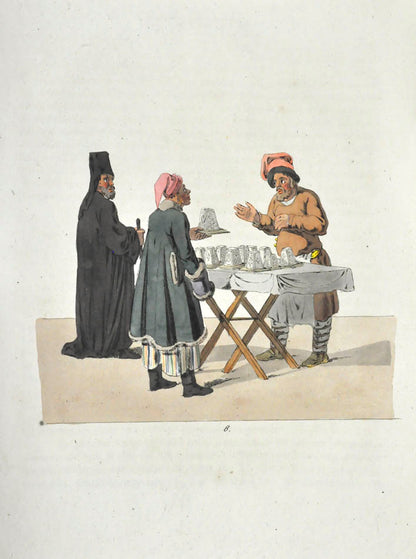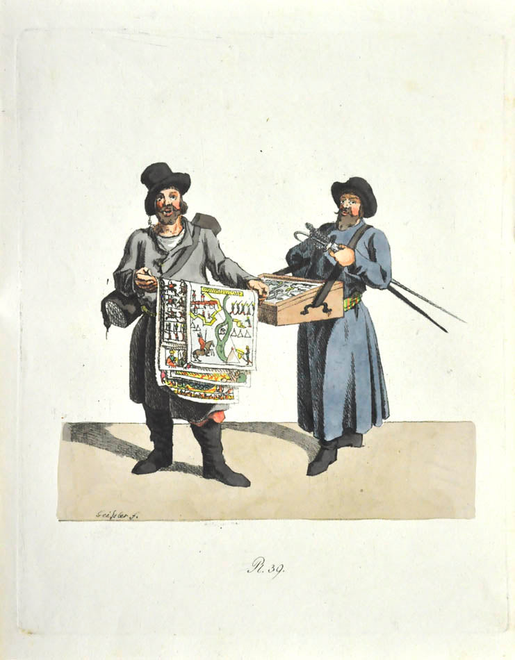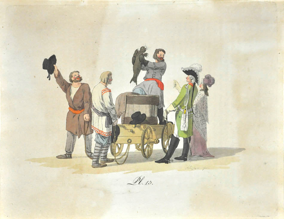 Fine, fresh copy of this important illustrated work on Russian habits and costumes.Christian Heinrich Geissler (1770-1844) was a famous German draughtsman who frequently worked for the Imperial court in Russia. Born in Leipzig, he quickly gained fame for his engravings of costumes and animated landscapes. After Geissler published a catalogue of Russian military uniforms enriched with 88 illustrations, the Imperial advisor Peter Simon Pallas offered his fellow countryman to join him on his expedition through Russia and the Caucasus with the role of illustrator and draughtsman. While Geissler spent most of the 1790s in Saint Petersburg, the expedition with Pallas took took him to the Southern Russia in 1793-1794 and resulted in the publication of several collections of engravings based on the sketches Geissler had made during his lengthy trip.