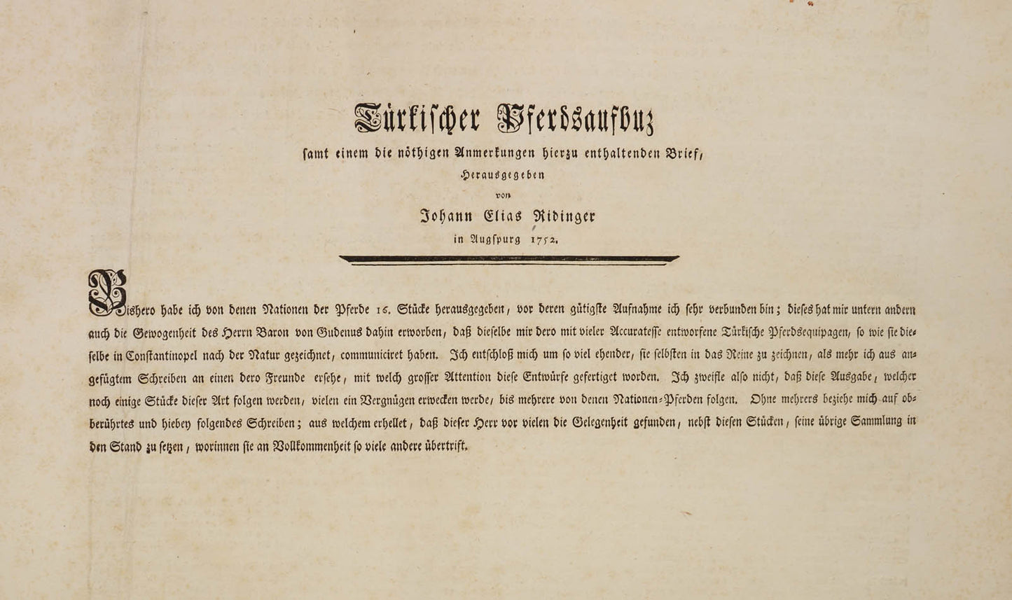 i. Türkischer Pferdsaufbuz (sic). Augsburg, 1752, printed title, 4 engraved plates, title lightly spotted. [Nissen (ZBI), 3412 (?incorrectly giving date as c.1741, but seemingly without title page, which is present here); Thienemann, 594-597].