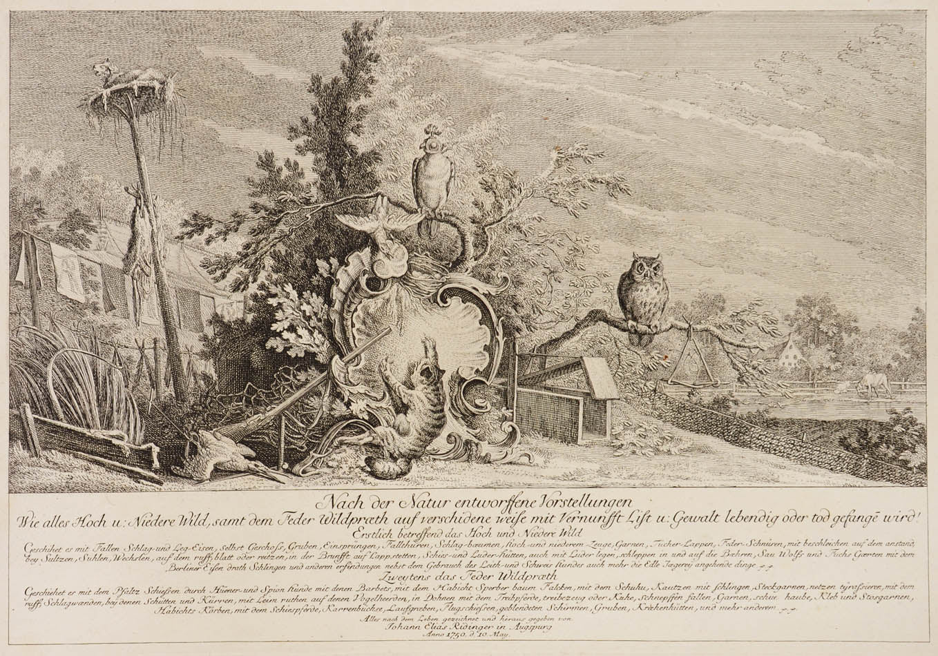 iii. [Die Fangarten der wilden Thiere]. Nach der Natur entworffene Vorstellungen wie alle Hoch u[nd] Niedere Wild. Augsburg: J.E. Ridinger, 1750, 30 engraved plates, including title, about 10 plates ?supplied from a smaller copy. [Nissen (ZBI), 3397; Schwerdt III, 135; Thienemann, 69-98].