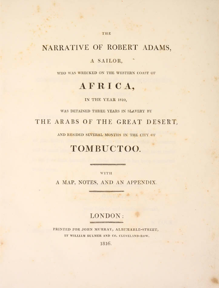 a sailor, who was wrecked on the Western coast of Africa in the year 1810, was detained three years in slavery by the Arabs of the Great Desert, and resided several months in the city of Timbuctoo.