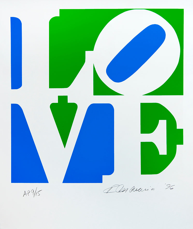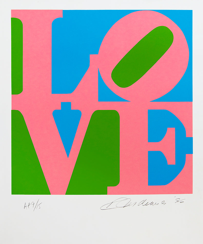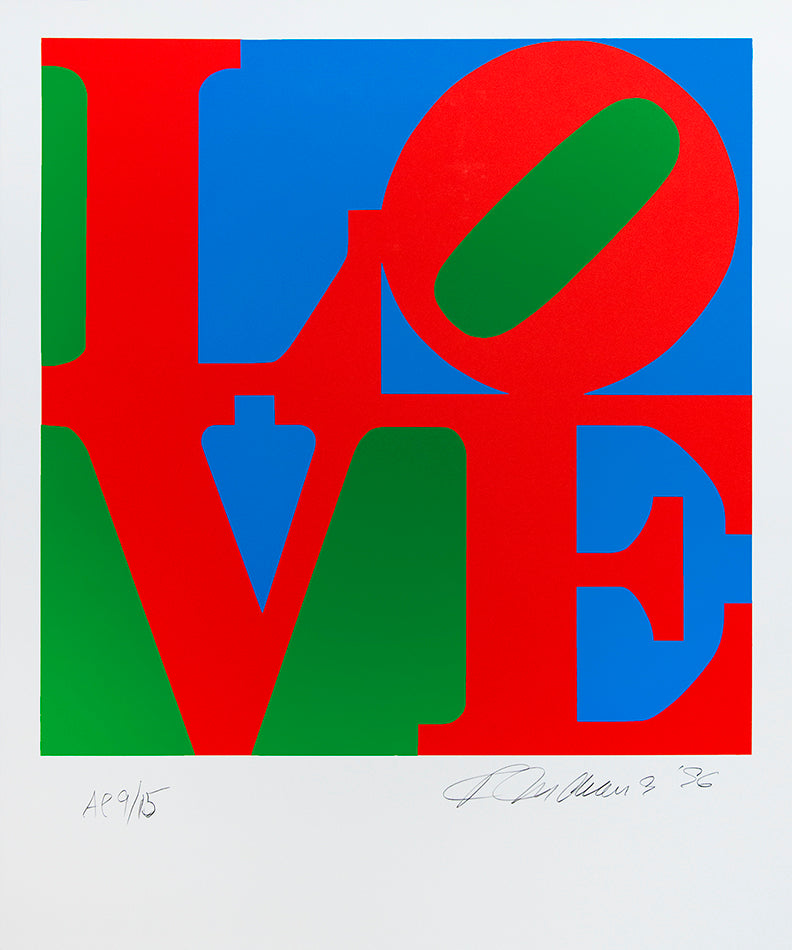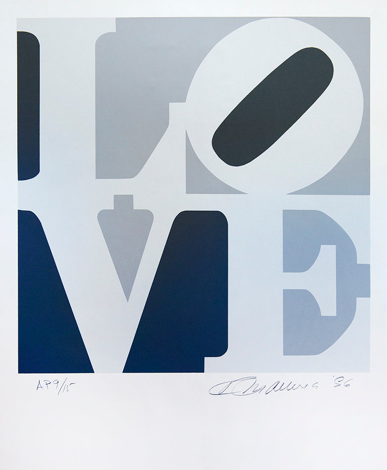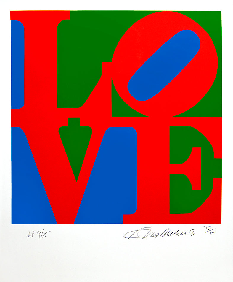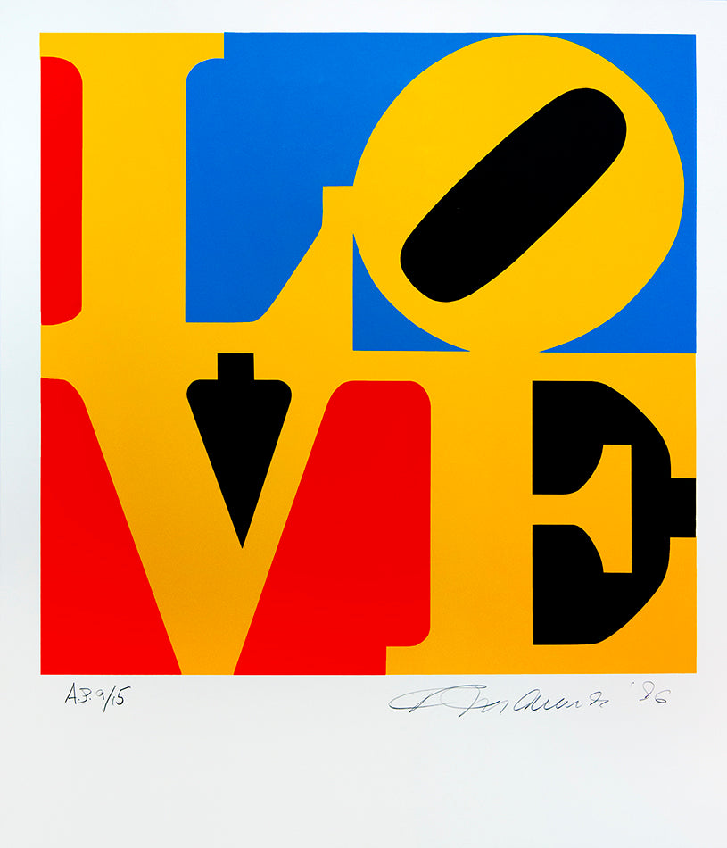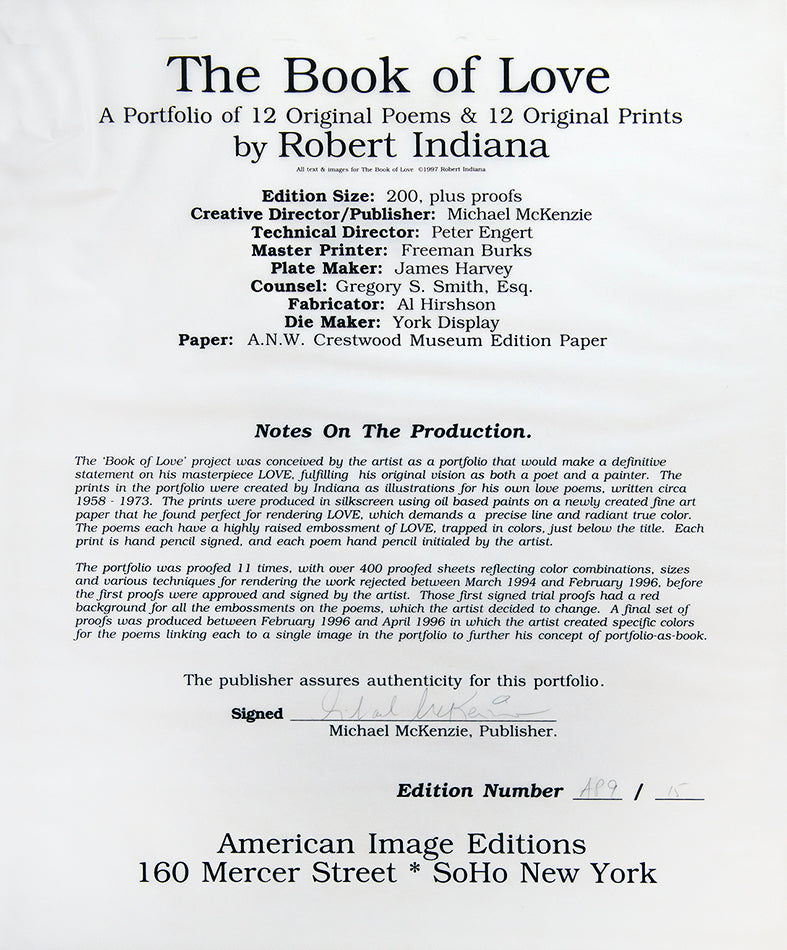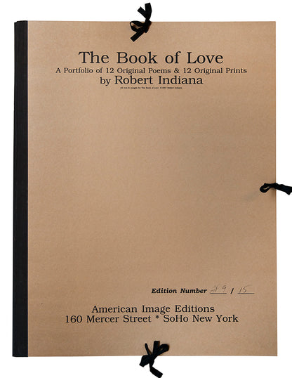 The everyday symbols that pervaded the highways and roadsides of Indiana's Midwestern childhood was a source of inspiration for his art. Moving to New York in 1954, Indiana adopted hard-edge painting techniques, influenced by his then-lover Ellsworth Kelly, whose paintings are said to have inspired the colour palettes for LOVE. LOVE first appeared in the 1961 painting 4-Star Love and the 1964 painting Love is God, before MoMA commissioned Indiana to design their Christmas card in 1964, for which Indiana submitted the LOVE icon we know today. This portfolio is Indiana's most elaborate extension of the motif, including twelve of his own love poems written between 1958-73 and 12 different colour variations of the icon, the largest array to date.