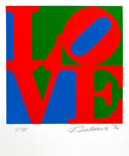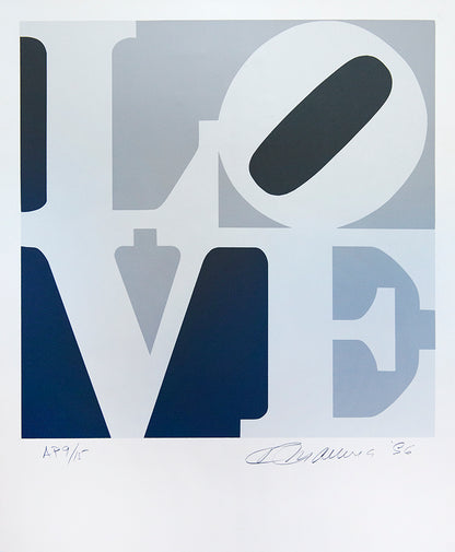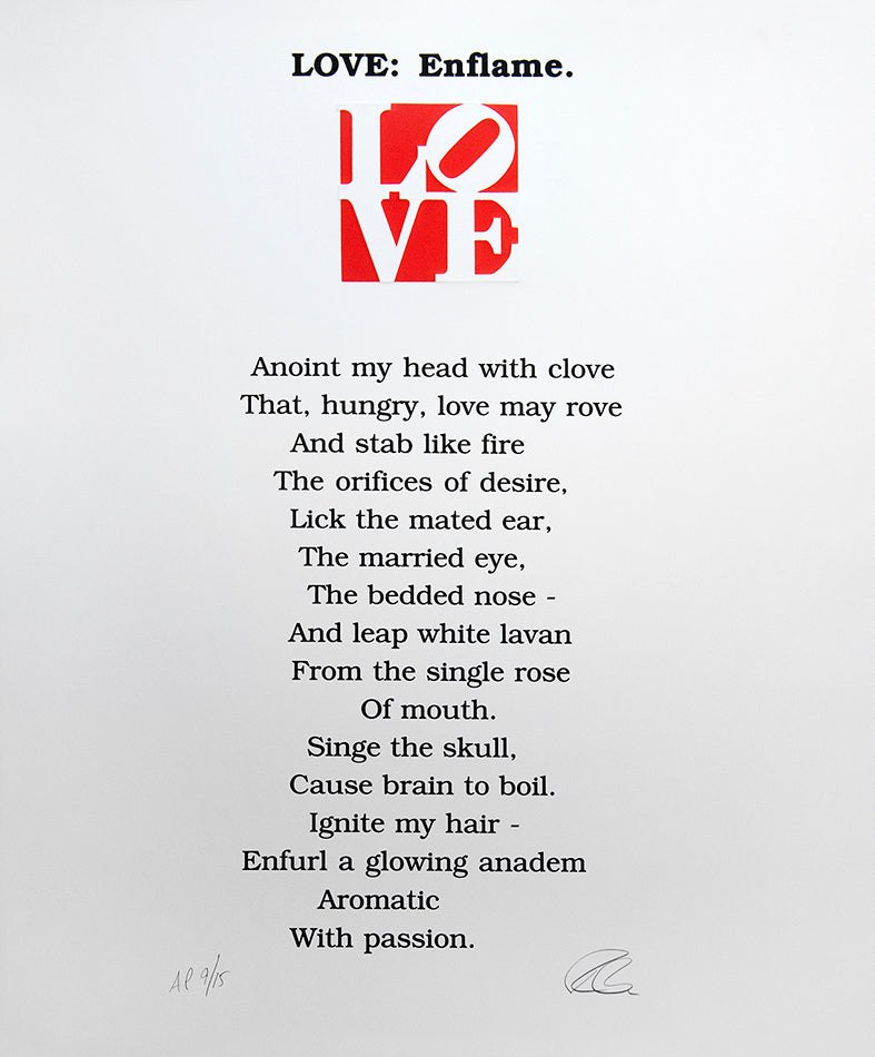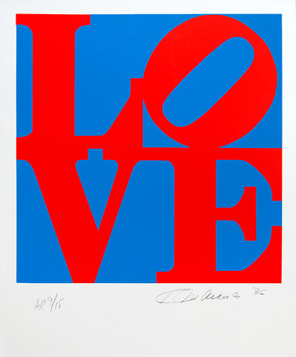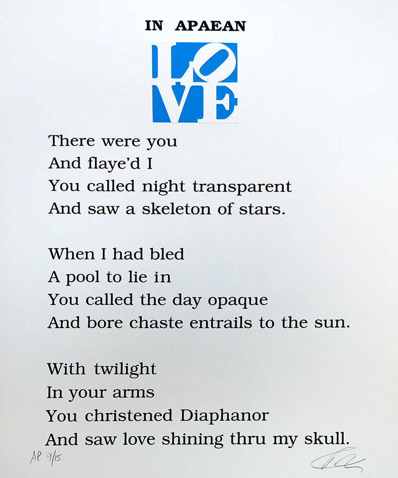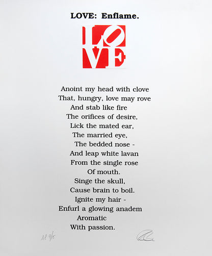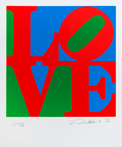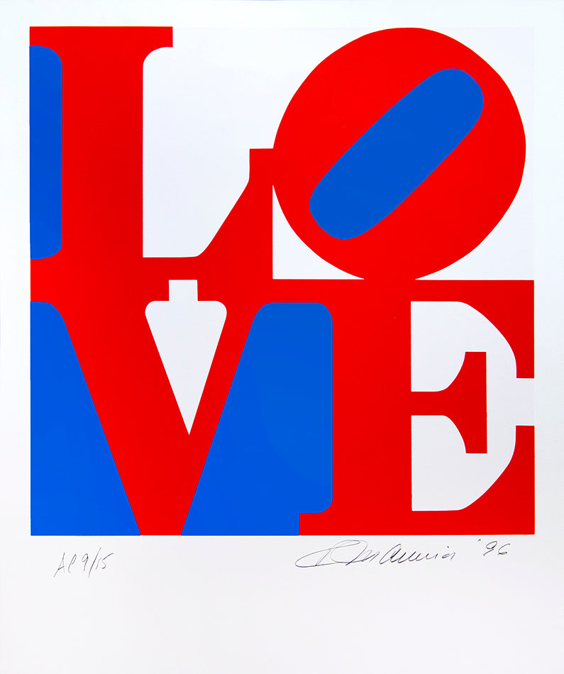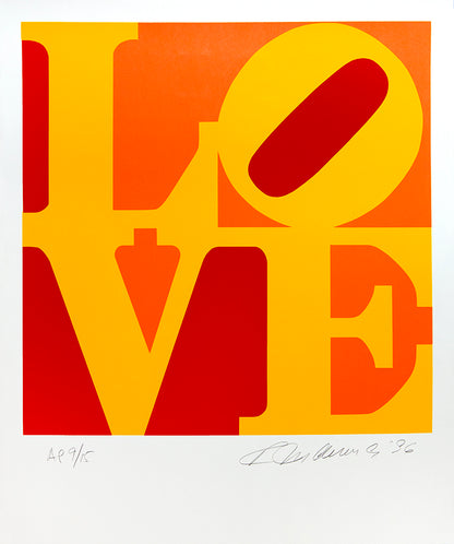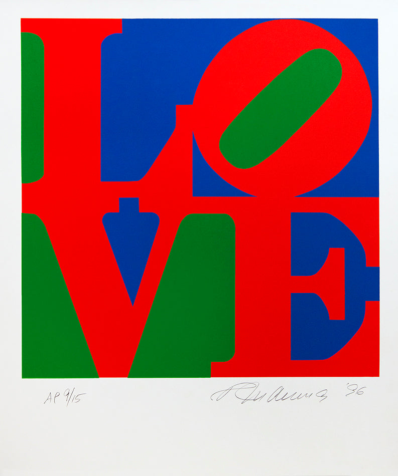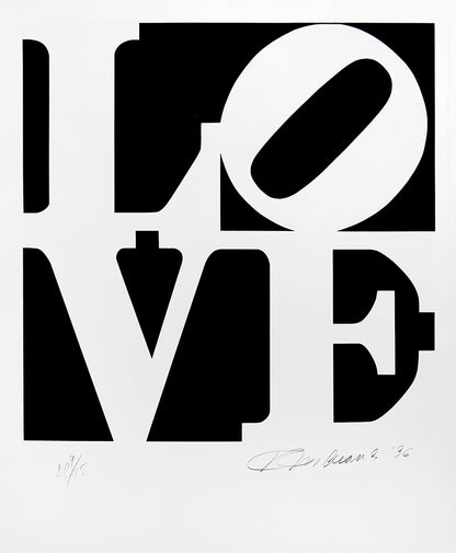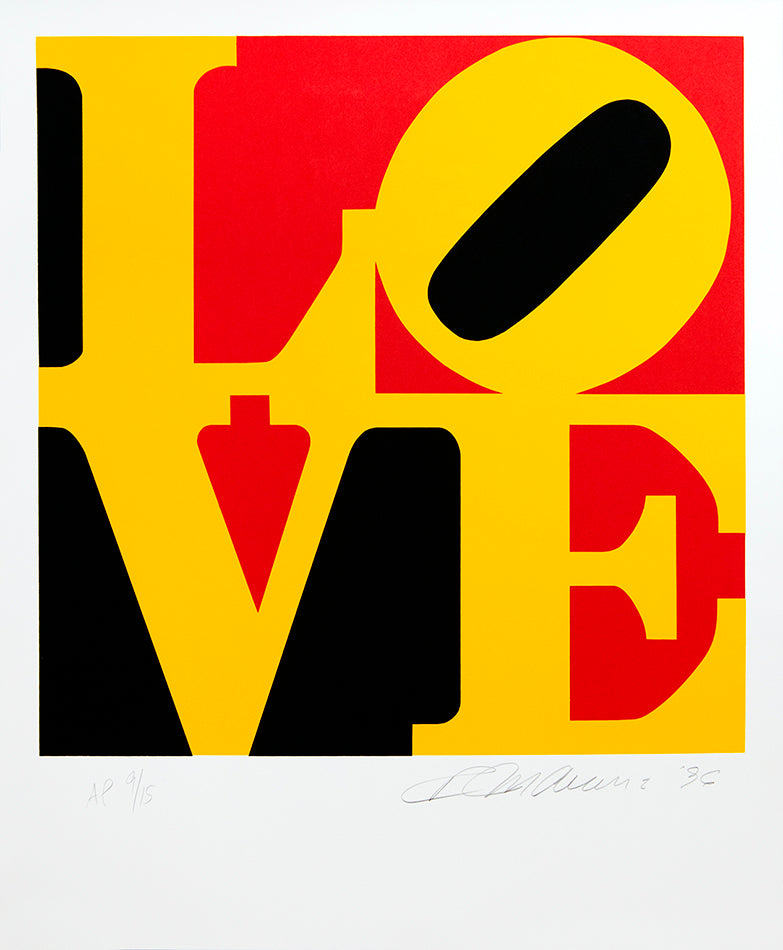 The everyday symbols that pervaded the highways and roadsides of Indiana's Midwestern childhood was a source of inspiration for his art. Moving to New York in 1954, Indiana adopted hard-edge painting techniques, influenced by his then-lover Ellsworth Kelly, whose paintings are said to have inspired the colour palettes for LOVE. LOVE first appeared in the 1961 painting 4-Star Love and the 1964 painting Love is God, before MoMA commissioned Indiana to design their Christmas card in 1964, for which Indiana submitted the LOVE icon we know today. This portfolio is Indiana's most elaborate extension of the motif, including twelve of his own love poems written between 1958-73 and 12 different colour variations of the icon, the largest array to date.