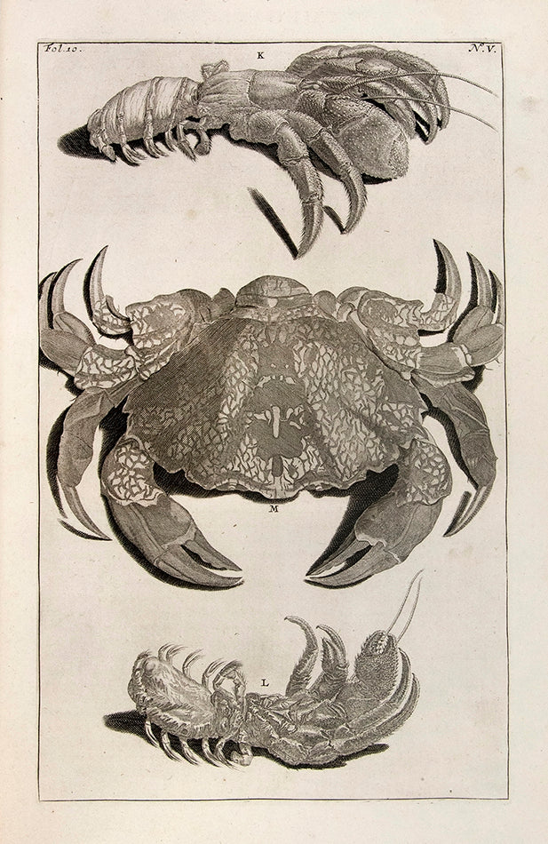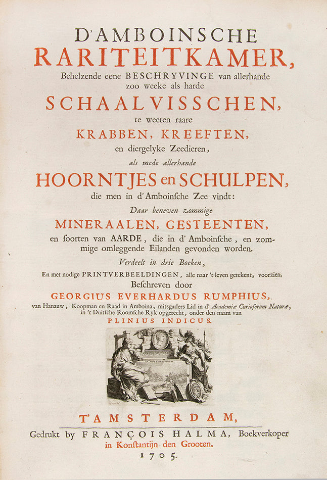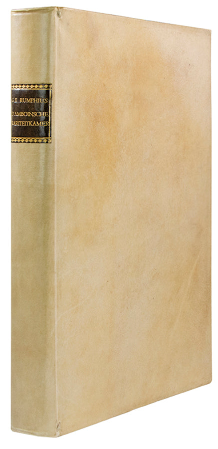 This is one of the most famous books on shells, by one of the most important naturalists of the pre-Linnaean period. Rumphius (1627-1702) was a Dutch naturalist born in Hanau, Germany. He was employed by the Dutch East India Company. He spent most of his life on the Island of Ambon, and did not live to see the appearance of his book. In D'Amboinsche Rariteitkamer (The Ambonese Curiosity Cabinet), Rumphius named most of the common Pacific shells.First edition; folio, (40.4 x 26.7 cm); complete with engraved author portrait and architectural frontispiece and 60 further engraved plates, tissue repair to top of frontispiece, light tears on pp.2, 45, 283, missing corner on p.283, tape repair to plate xli; recent vellum binding; 340pp.
