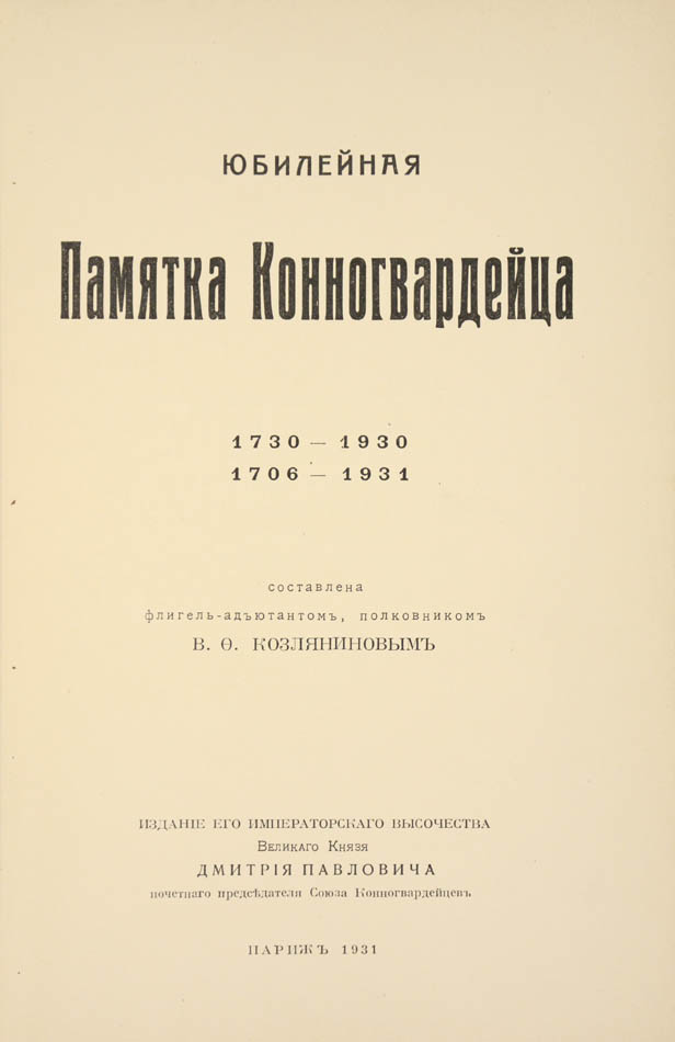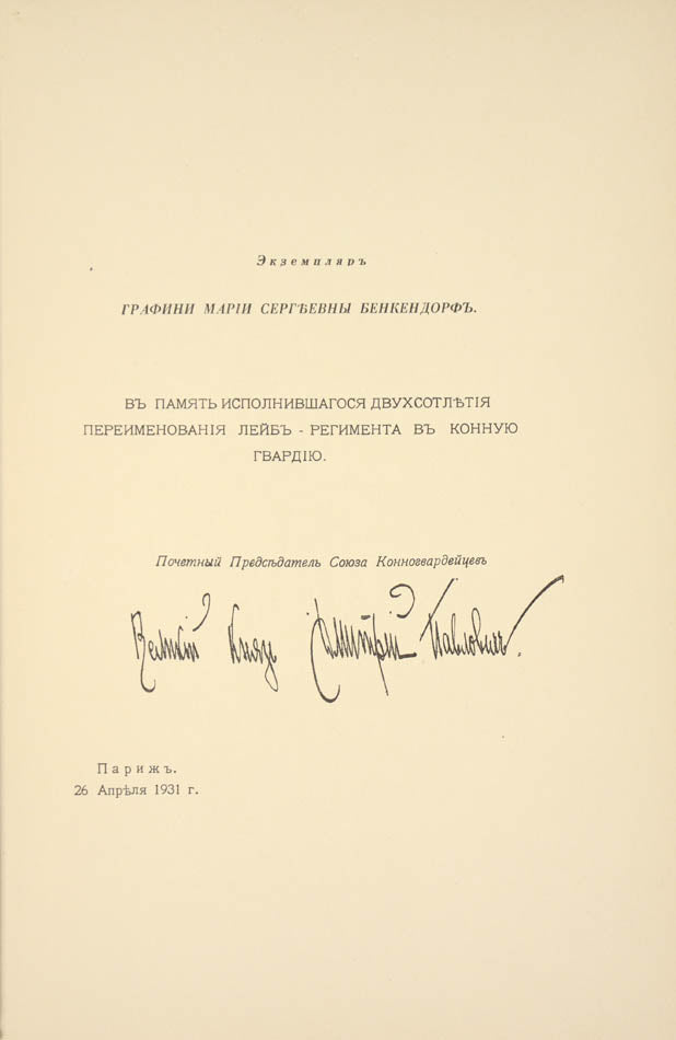 This copy is number 122, one of the 250 copies that have been presented by Grand Duke Dmitriy to Members of the Russian Imperial Family, to all members of the Association of Former Officers of the Horse Guards and to some National Libraries.