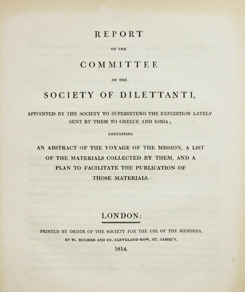 'This report describes the activities of the Society of Dilettanti's second Ionian Mission, 1812-13, organized under the direction of William Gell' (Blackmer).