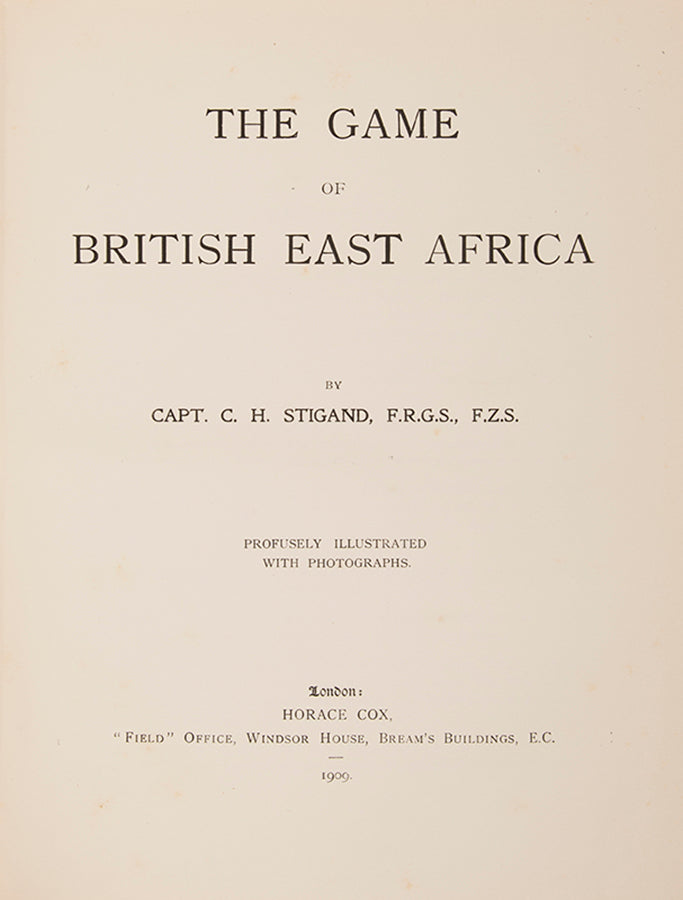'A handsome volume that examines wild game, its habitat, and spoor within Kenya, Uganda, and the eastern Congo regions. Stigand observes game traits on the plains, and in the bush and forested areas, detailing animal movements, coloration, and even preservation of game. There are interesting chapters comparing hunting big game to shooting, and on stalking' (Czech).