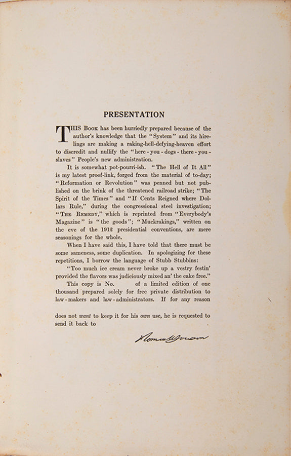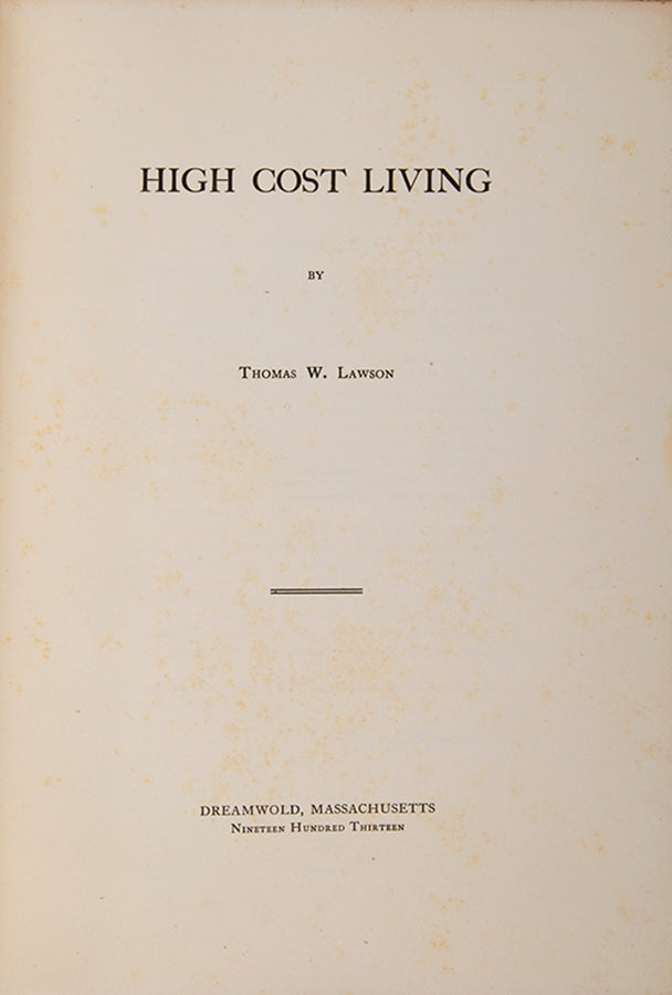 Author's personal copy. Thomas Lawson's (1857-1925) personal copy of High Cost Living, his amusing 'insider's account of the pecuniary guile of an era filled with stock market machination' (ANB).