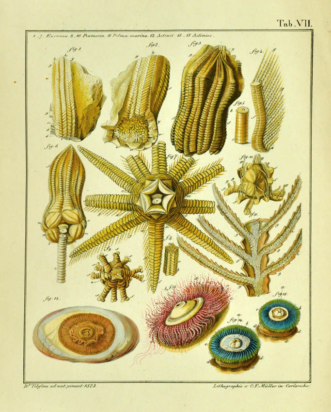 Fine hand-coloured plates of fossils. The plates from the first and only edition of an early work on fossilised invertebrates by the German naturalist and draftsman Wilhelm Gottleib Tilesius von Tilenau (1769-1857), finely hand-coloured and rare in commerce.