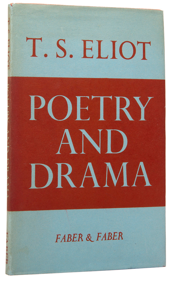With the dustjacket. An very good first edition of T.S. Eliot's Poetry and Drama, a publication of his address delivered at Harvard University in November 1950. Its theme is the use of poetry for dramatic purposes, and the effect of the dramatic purpose upon the poetry.