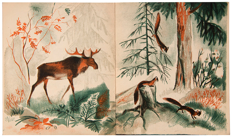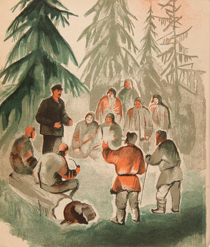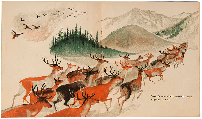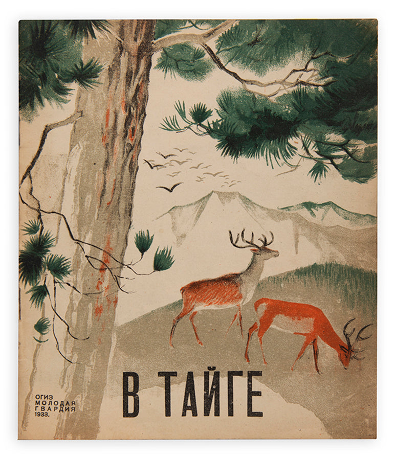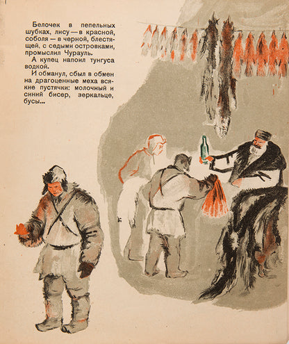 A vividly illustrated story set in the Siberian taiga tells the story of Churaul', a brave and sharp-eyed Evenk hunter who catches foxes, sables, and squirrels. The local vodka-drinking merchant doesn't offer him a fair price for his beautiful furs but Churaul' has no choice but to accept in order to feed his daughter. He also has to pay taxes to the Tsar and so must head out in to the wilderness again in bad weather to catch more furs. The story ends positively, however, as the new people have come to the taiga - Russians. With them comes fair prices for furs and soviet meetings are convened to discuss local matters.The illustrator Anna Borovskaia was born in Konevo, a tiny village in Arkhangelsk province in 1901. Her rural and northerly upbringing no doubt inspired the beautiful illustrations for this book. Borovskaia first studied at the Vologda school of art and then Vkhutemas-Vkhutein between 1923 and 1929. A pristine example of a scarce work.
