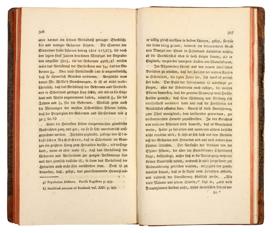 First German edition, 2 vols, 8vo (20 x 12.5 cm). pp. xvi, 368; pp. vii, 358; very slight spotting to vol. 1. Contemporary half-brown leather binding; flat spine, gilt bands separating compartments, compartments 1, 3, 5 and 6 contain gilt floral decoration, compartments 2 and 4 contain gilt lettering including translator's name and title, gilt library stamp to both upper boards, library stamps to verso of both upper boards and title pages, pencil markings to verso of upper boards and endpapers; rubbed, water or possibly glue marks to verso of upper boards and endpapers.
