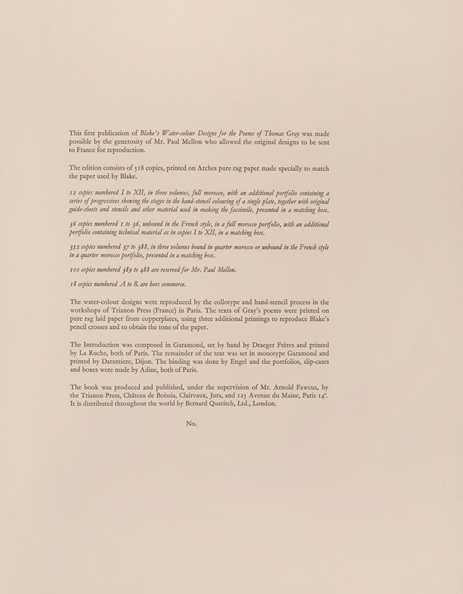 The Trianon Press reproductions are recognised as the finest facsimiles, hand-coloured through stencil, referencing the originals in Paul Mellon's collection. The reproduction was a mammoth undertaking, employing eighteen artists for four years and using up to forty-two stencils per plate. This three-volume set, limited to 352 copies, is one of the grandest of the Trianon Press William Blake facsimiles, with the Times Literary Supplement stating that nothing like these books had been printed before, and that it was unlikely they could ever be printed again.