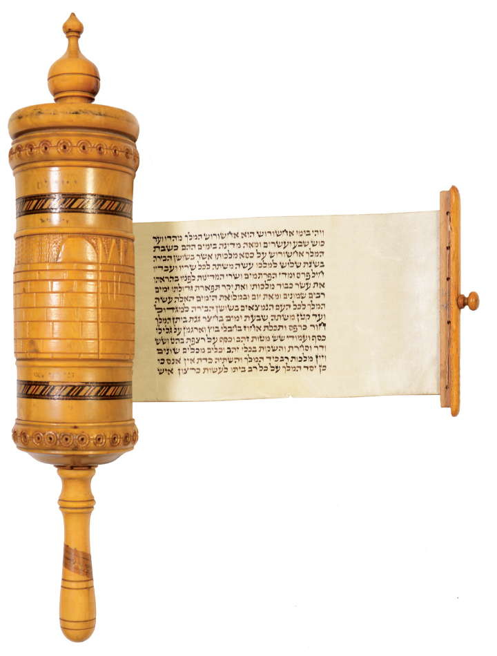 'Since the Talmudic period it has been customary to write the Book of Esther on parchment in the form of a scroll, and the rules governing its production and writing are basically the same as those for a traditional Torah scroll. It is not known when and under what circumstances artistic embellishment of Esther scrolls began. The earliest extant illuminated examples emanate from 16th-century Italy,